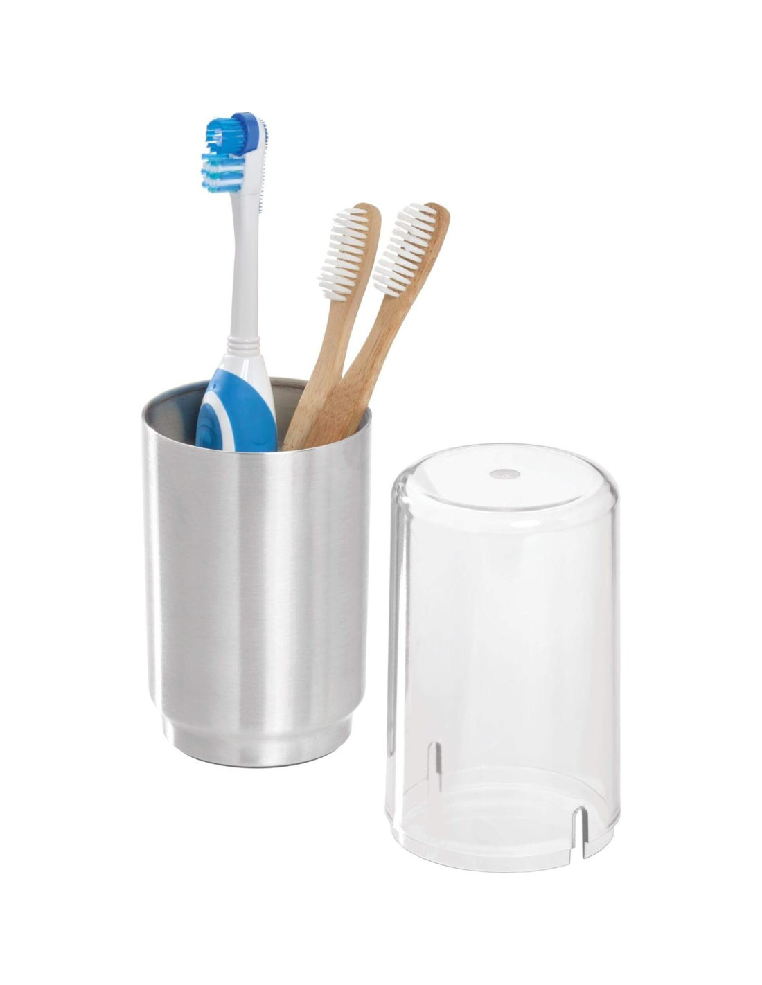 Organiza el tocador de tu baño con estilo con el Soporte para Cepillos de Dientes iDesign Austin. Este soporte cubierto mantiene los cepillos de dientes (incluyendo cepillos eléctricos y de giro más grandes) y la pasta de dientes en posición vertical y al alcance del lavabo, mientras que la tapa removible mantiene los artículos dentro del contenedor protegidos y limpios. La tapa transparente asegura que los artículos siempre sean visibles y accesibles, mientras que los agujeros de ventilación permiten que los cepillos de dientes mojados se sequen con la tapa puesta. Diseñado con versatilidad en mente, también se puede usar para almacenar brochas de maquillaje, cosméticos, aplicadores, rasuradoras y más. El diseño moderno con acabado de níquel cepillado y tapa clara combina con una variedad de estilos de decoración. Hecho con acero duradero y plástico libre de BPA, este soporte para cepillos de dientes soporta el uso diario y es fácil de limpiar con jabón suave y agua. Midiendo 7.62 cm x 7.62 cm x 22.86 cm, este organizador es ideal para espacios compactos en mostradores de baño, en gabinetes o debajo del lavabo. Con iDesign de InterDesign, puedes vivir simplemente todos los días.