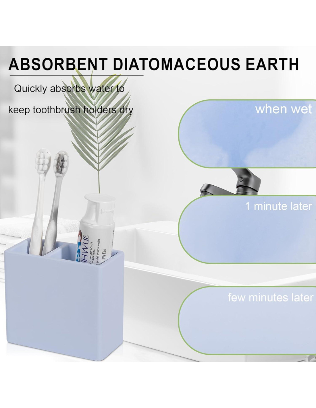 - Secado Súper Rápido: Este soporte para cepillos de dientes está hecho de tierra diatomácea natural que absorbe la humedad rápidamente. También se seca rápidamente cuando tienes humedad residual en tu cepillo de dientes, manteniendo tu baño ordenado y organizado.