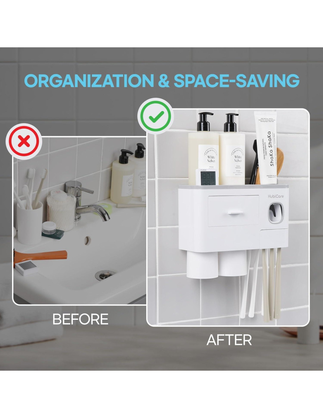 - [Soporte para Cepillos de Dientes Multiusos] Equipado con 1 bandeja, 1 compartimento de almacenamiento y 1 cajón, el soporte para cepillos de dientes HubiCare no solo es adecuado para almacenar tu taza de cepillo y cepillo de dientes, sino que también proporciona una gran capacidad de almacenamiento para varios artículos como peines, cepillos de dientes, pasta de dientes, jabón y maquinillas de afeitar. Almacena libremente cosméticos y suministros de baño de uso frecuente, y mantén tu encimera de baño limpia y organizada.