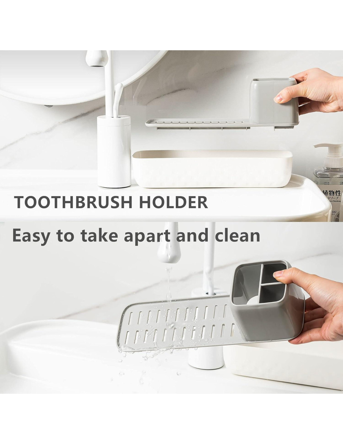 - Di adiós al desorden: El juego de soporte para cepillos de dientes de plástico para baño tiene 3 ranuras, los cepillos de dientes y la pasta de dientes se pueden colocar por separado, manteniéndose limpios; La bandeja inferior asegura que el exceso de agua termine en la bandeja inferior del soporte para cepillos de dientes, no en tu lavabo o encimera, manteniendo tu encimera seca, además solo ocupa un espacio mínimo en tu encimera de baño