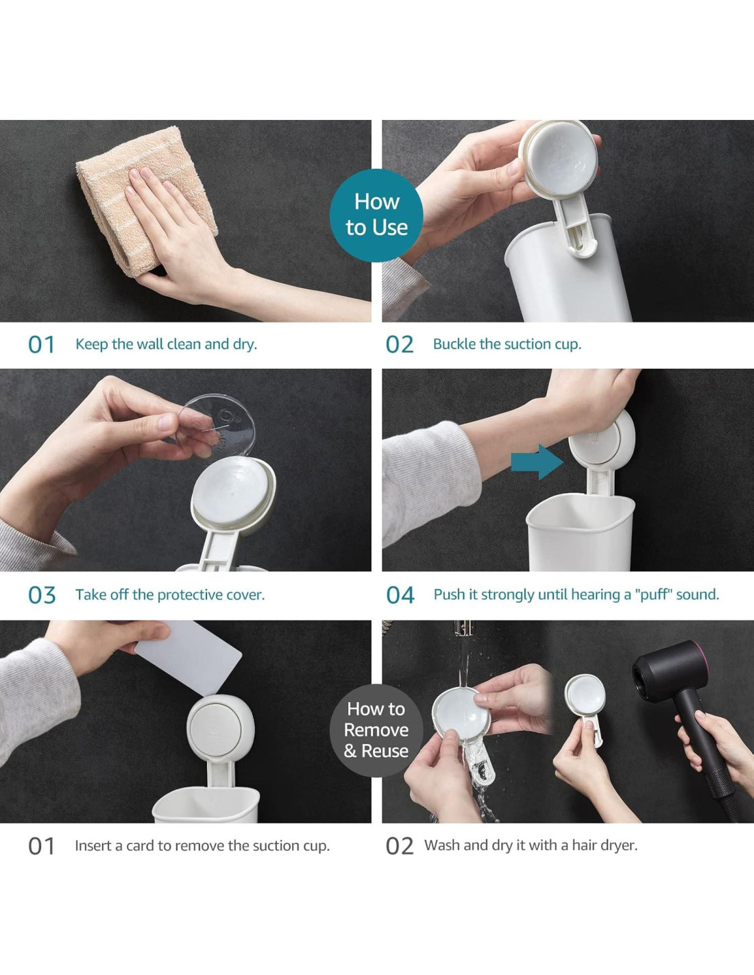 - Removible y reutilizable: El soporte de cepillo de dientes de succión es fácil de quitar y reinstalar en una nueva ubicación para reutilizar. Simplemente usa una tarjeta de crédito para quitar la taza de succión y lávala con agua tibia antes de reinstalar. Nuestro exclusivo soporte de tazas de succión al vacío es ideal para condominios y alquileres
