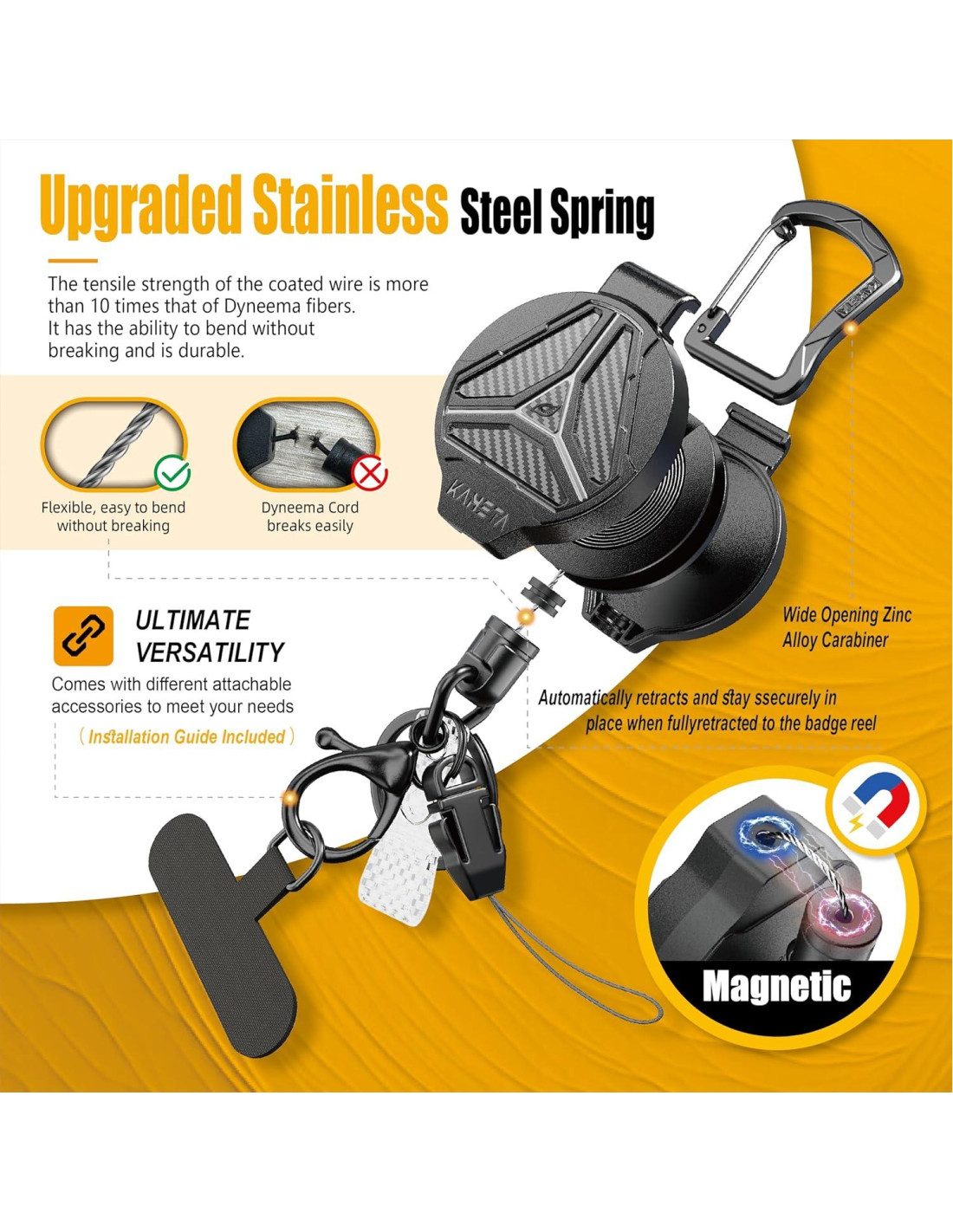 - [Diseño de Cierre Magnético Seguro] El llavero retráctil innovador de KAHETA cuenta con un sistema de bloqueo magnético diseñado para soportar hasta 15 oz (425.24 g). A diferencia de la mayoría de los reels de insignia retráctiles con cierres poco confiables, nuestro Porta Insignia utiliza un sello magnético especializado para evitar que el cable se hunda o se afloje, incluso después de miles de retracciones. Extiende el cable sin esfuerzo para agarrar llaves, insignias de identificación o accesorios, y observa cómo vuelve a su lugar de forma segura al soltarlo. No más cables flojos o insignias caídas