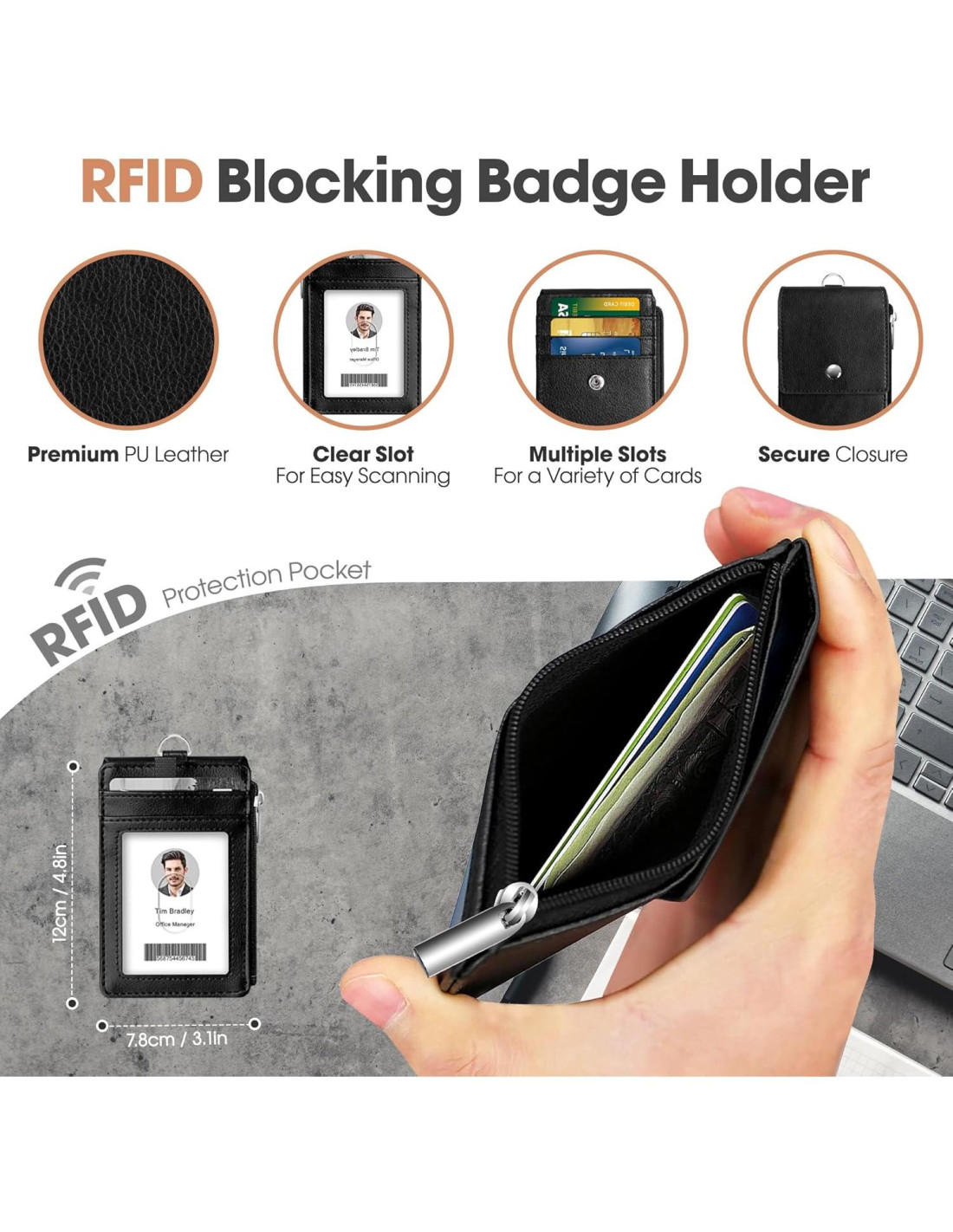 - Billetera de soporte de insignia RFID segura y de alta capacidad: Este soporte de insignia vertical (4.8" (12.19 cm) de alto x 3.2" (8.13 cm) de ancho) está hecho de cuero sintético premium. Tiene una ranura para tarjeta transparente para un escaneo fácil y un bolsillo con cremallera que bloquea RFID para mantener tus tarjetas seguras. Puede contener hasta 5 tarjetas, incluyendo insignias de trabajo, identificaciones, tarjetas de crédito y tarjetas de visita, lo que lo hace perfecto para usar con soportes de identificación retráctiles o como billetera de cordón.