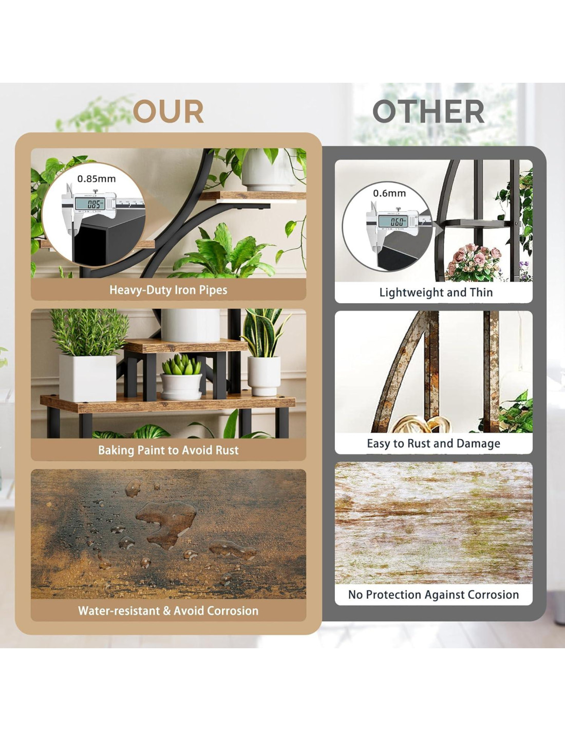 - [Estable y Robusto] El marco de este soporte de plantas está hecho de tubería de hierro de alta resistencia que tiene 0.85 mm de grosor, asegurando una estructura robusta y una fuerte capacidad de carga. La superficie de la tubería de hierro está recubierta con pintura horneada especial para evitar la oxidación. Las tablas gruesas están construidas de aglomerado y recubiertas con una capa resistente al agua para evitar la corrosión, deformación y curvatura.