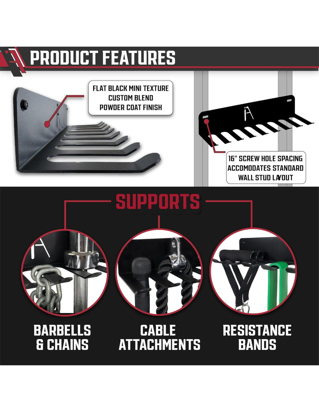 - Estante de almacenamiento de gimnasio de pared resistente fabricado en EE. UU.: Este colgador de pared de almacenamiento de gimnasio de 18 pulgadas (45.72 cm) / 9 ganchos está hecho de acero de 12 calibres fabricado en EE. UU. - recubierto en polvo con un acabado negro mate para un uso resistente en cualquier clima o entorno; perfecto para almacenamiento de equipo de gimnasio en casa.