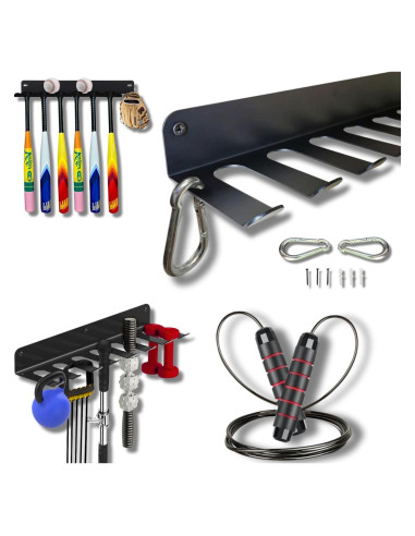 - Estante de pesas de alta resistencia + incluyendo cuerda para saltar. Este soporte de pesas para pared, equipo de banda de garaje, ganchos para cuerdas para saltar fue fabricado con acero resistente a la mayoría de los entornos. Realiza entrenamientos de alta calidad, manteniendo tu entorno organizado con este estante para bandas de fitness y otros equipos de entrenamiento.