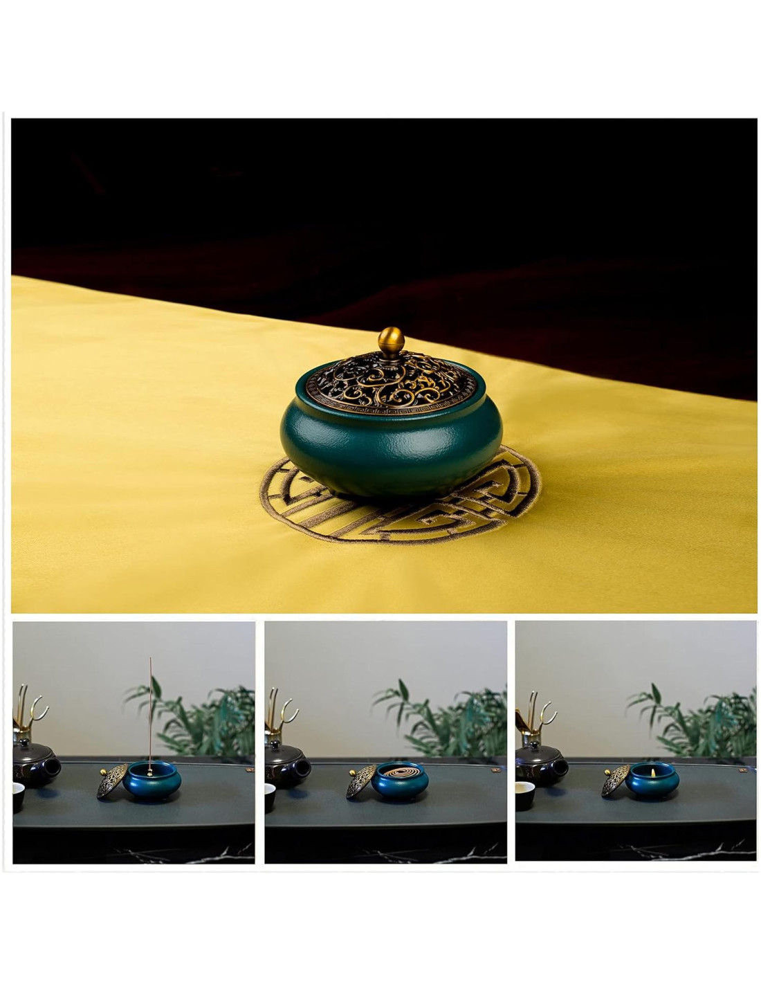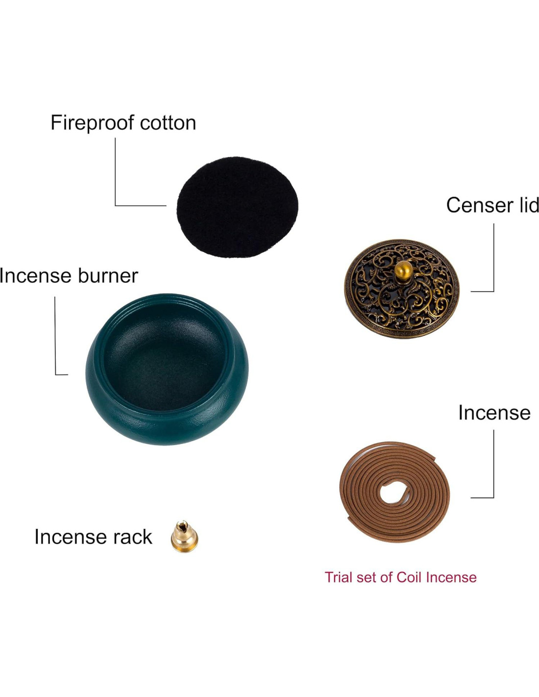 - Tapa de Metal Hueca Tallada, Soporte de Incienso y Algodón a Prueba de Fuego. La tapa de metal hueca intrincadamente tallada permite que el humo escape elegantemente. Viene con un soporte de incienso de latón y algodón a prueba de fuego para una quema segura y limpia.