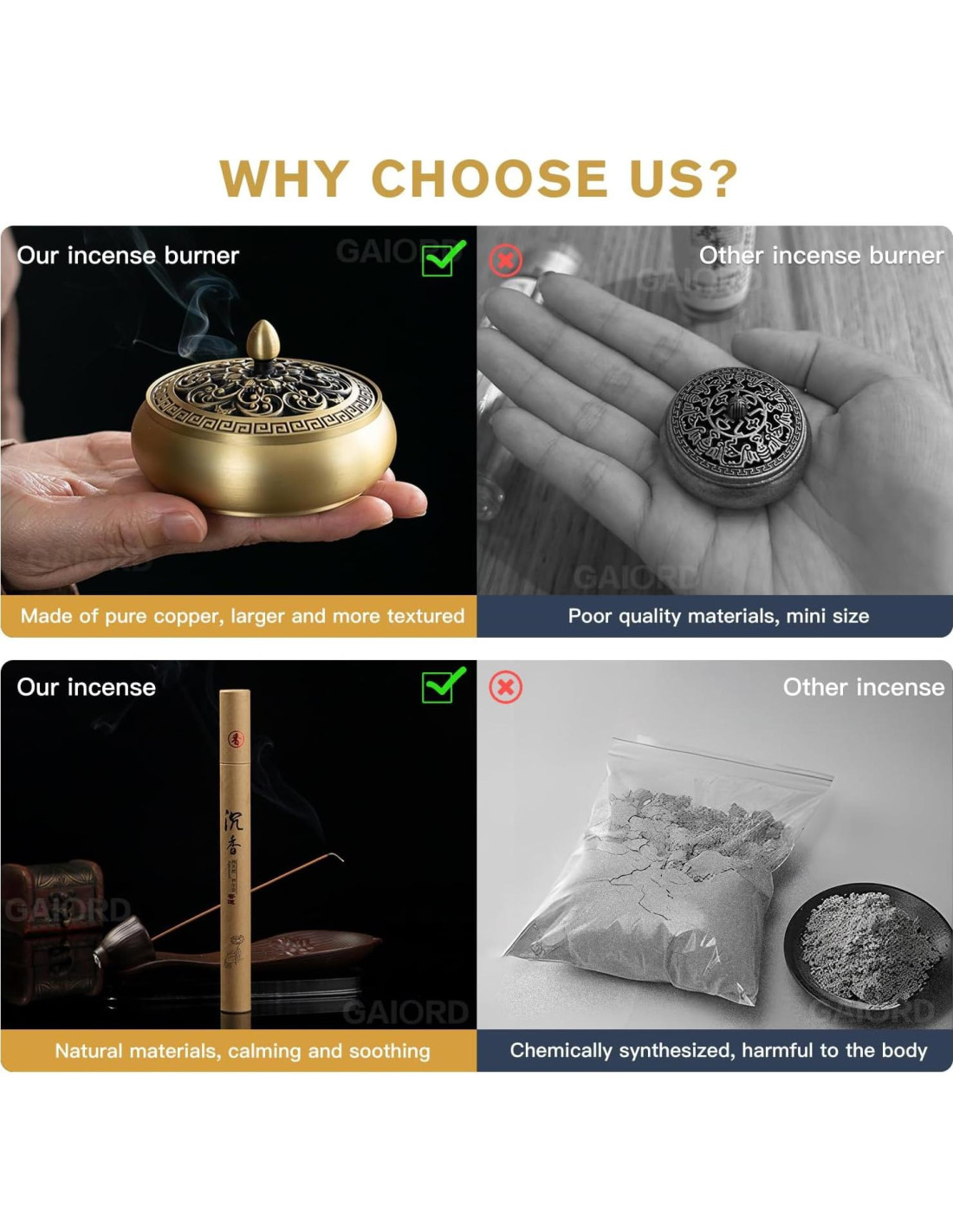 - Conjunto completo: Kit completo de 29 artículos; incluye quemador de incienso de cobre * 1, soporte para varillas de incienso de loto * 1, molde para incienso de cobre * 2, cuchara para incienso de cobre * 1, prensa para incienso de cobre * 1, pala para incienso de cobre * 1, cepillo de limpieza de cobre * 1, molde para conos de incienso * 1, ceniza blanca natural * 2, polvo de ámbar gris natural * 1, varillas de incienso naturales * 4, incienso en espiral de sándalo * 2, tapete para incienso * 1, bandeja de madera * 1, algodón retardante de llama * 9, instrucciones * 1; no es necesario comprar accesorios adicionales