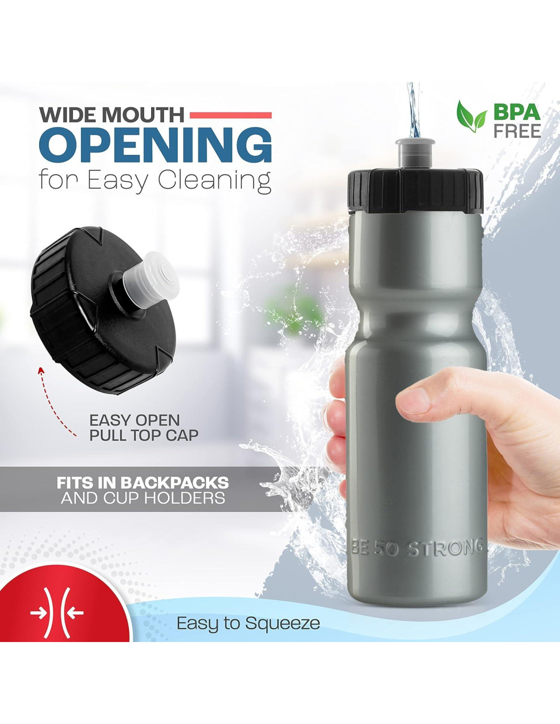 El combo de 2 paquetes de botella de agua deportiva y soporte para botella de agua 50 Strong es una gran opción para ciclistas de todos los niveles. Las botellas de 22 oz son libres de BPA, aptas para lavavajillas en la parte superior y tienen una tapa de apertura fácil. Los soportes para botellas de agua de bicicleta que acompañan son fáciles de instalar y se adaptan a la mayoría de las botellas de agua para bicicletas. Orgullosamente hecho en EE. UU.