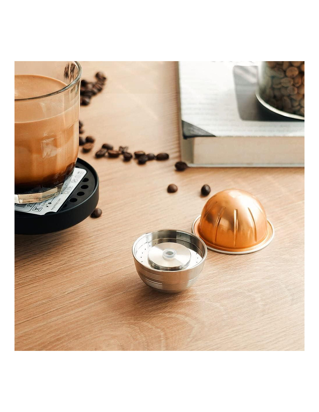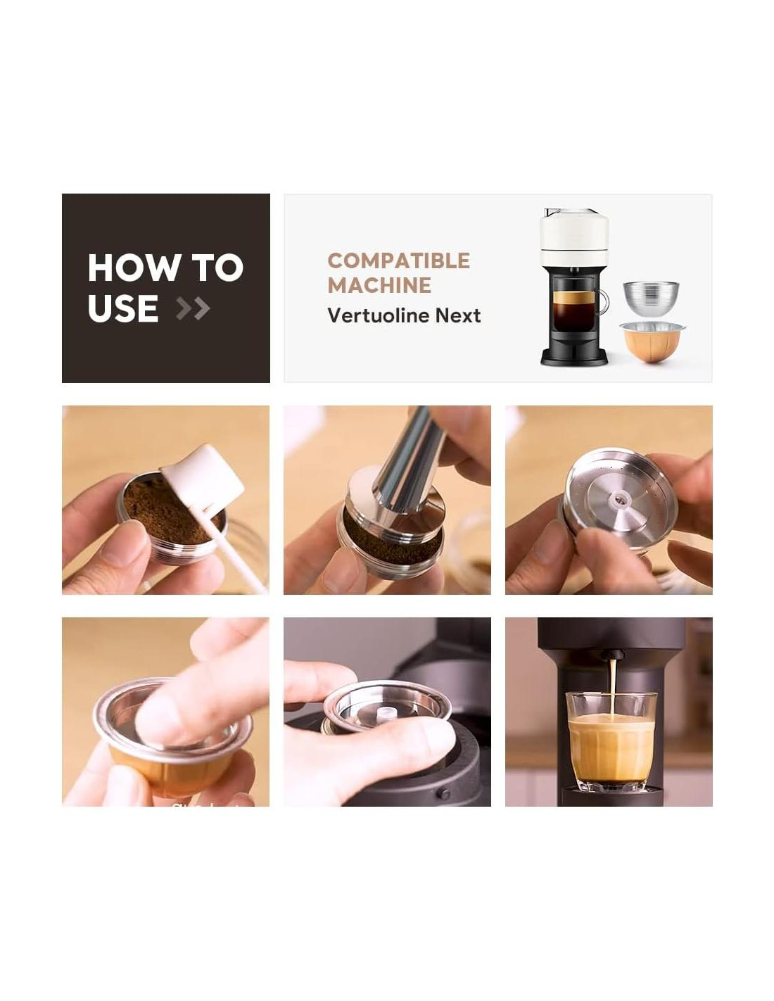 - [ALTA CALIDAD Y MÁS OPCIONES] Alta calidad hecha de acero inoxidable de grado premium, seguro para alimentos, no tóxico, ecológico, amigable con el medio ambiente: al elegir nuestra cápsula de espresso reutilizable y recargable de acero inoxidable para su soporte de cápsulas Nespresso Vertuoline, está optando por una vida más verde y ayudando a nuestro planeta a alejarse de más plástico y aluminio