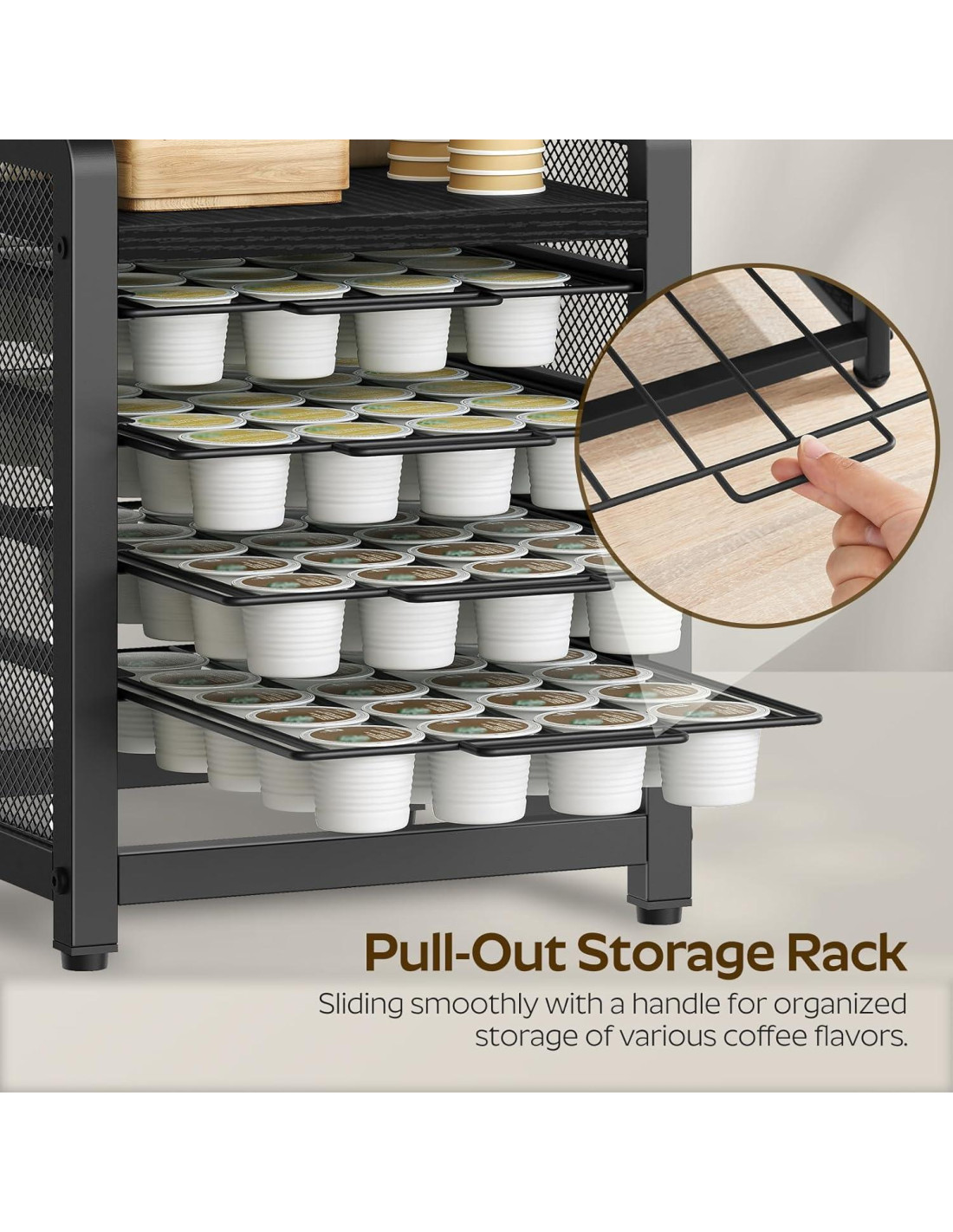 - Acceso y Monitoreo Conveniente: Los estantes extraíbles ofrecen fácil acceso a tu sabor de café favorito. El diseño de malla de hierro visual en ambos lados te permite monitorear fácilmente el suministro de cápsulas de café, ahorrándote la frustración de quedarte sin café