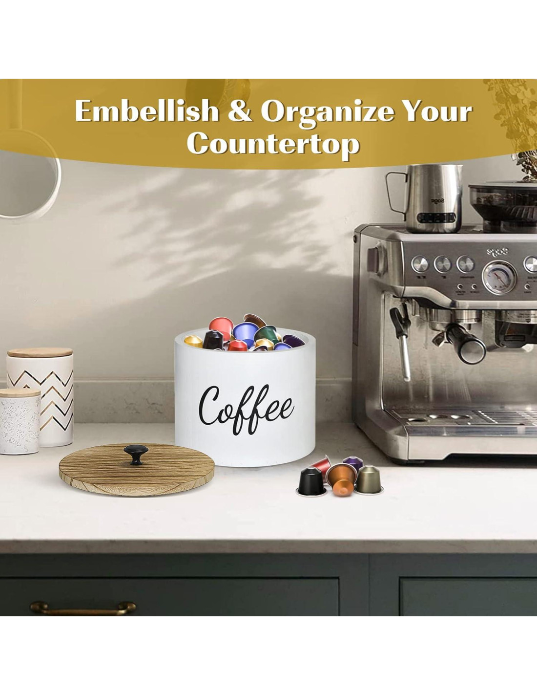 - DISEÑO RESISTENTE Y SIMPLE El soporte para cápsulas de café con tapa está hecho de madera maciza que garantiza su durabilidad y estabilidad en el uso diario. Y no se romperá después de un largo tiempo de uso. Con un asa en la parte superior que facilita abrirlo al usar. Con un acabado vintage desgastado y letras blancas en cursiva clásicas, nuestra cesta de almacenamiento de filtros de café cobra vida con un atractivo estilo campestre que le da un toque retro y mantiene tu barra de café cálida y hermosa.
