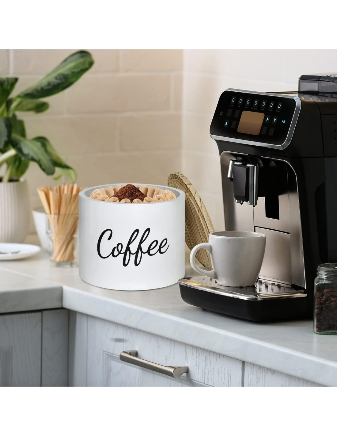 - AHORRO DE ESPACIO SUPERIOR Nuestro soporte de almacenamiento para filtros de café es muy adecuado para crear un espacio de café limpio y ordenado, permitiéndote acceder fácilmente a los filtros de café. La forma redonda se puede colocar en cualquier lugar cerca de la cafetera, en la encimera o en una estantería, facilitando el acceso y ahorrando espacio. Además de filtros y bolas de café, puedes almacenar otros pequeños artículos en recipientes rústicos con tapa, como granos de café, azúcar.