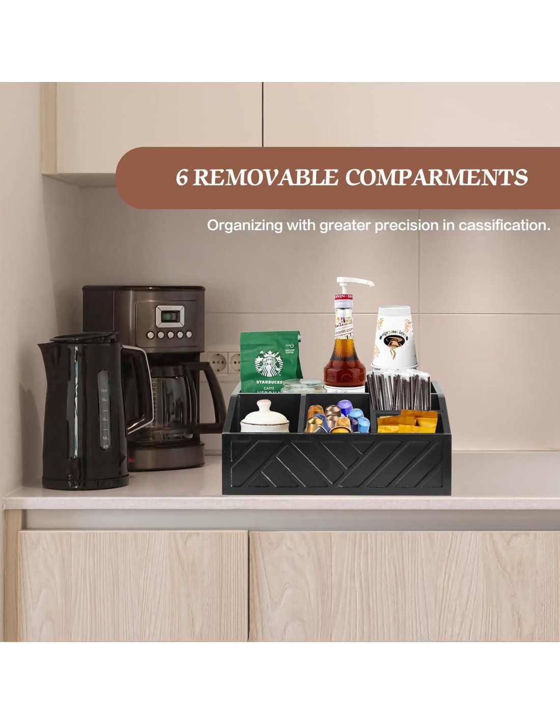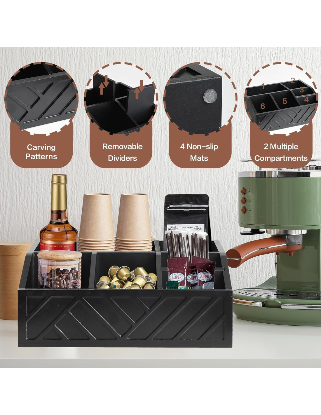 - Mantén organizados los accesorios de la barra de café. Con 6 compartimentos y 2 particiones removibles, nuestro organizador de barra de café proporciona la flexibilidad para organizar fácilmente tus diversos accesorios de café como cápsulas de café, azúcar, bolsas de té, café instantáneo, popotes, palitos de revolver, etc. Organiza todos tus elementos esenciales de la barra de café en este organizador de estación de café para ahorrar tiempo buscándolos y asegurar un reabastecimiento oportuno. Di adiós a la encimera desordenada y hola a una estación de café bellamente arreglada.