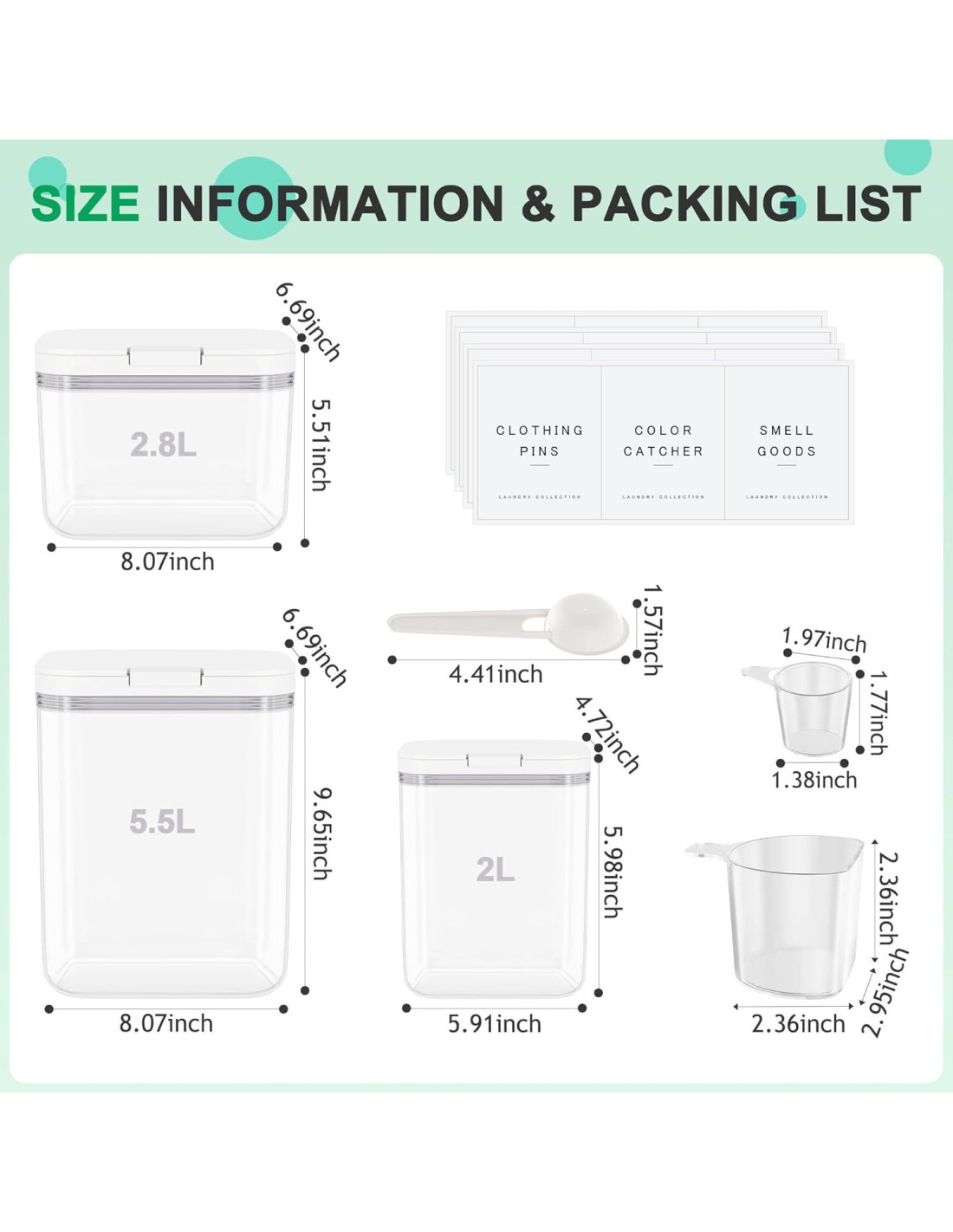 - FÁCIL DE USAR: Este contenedor de polvo de lavandería transparente incluye etiquetas, mantiene el detergente visible y organizado. Usa las cucharas incluidas para medir con precisión. Cuelga las cucharas en el soporte; también raspa para nivelar el polvo.