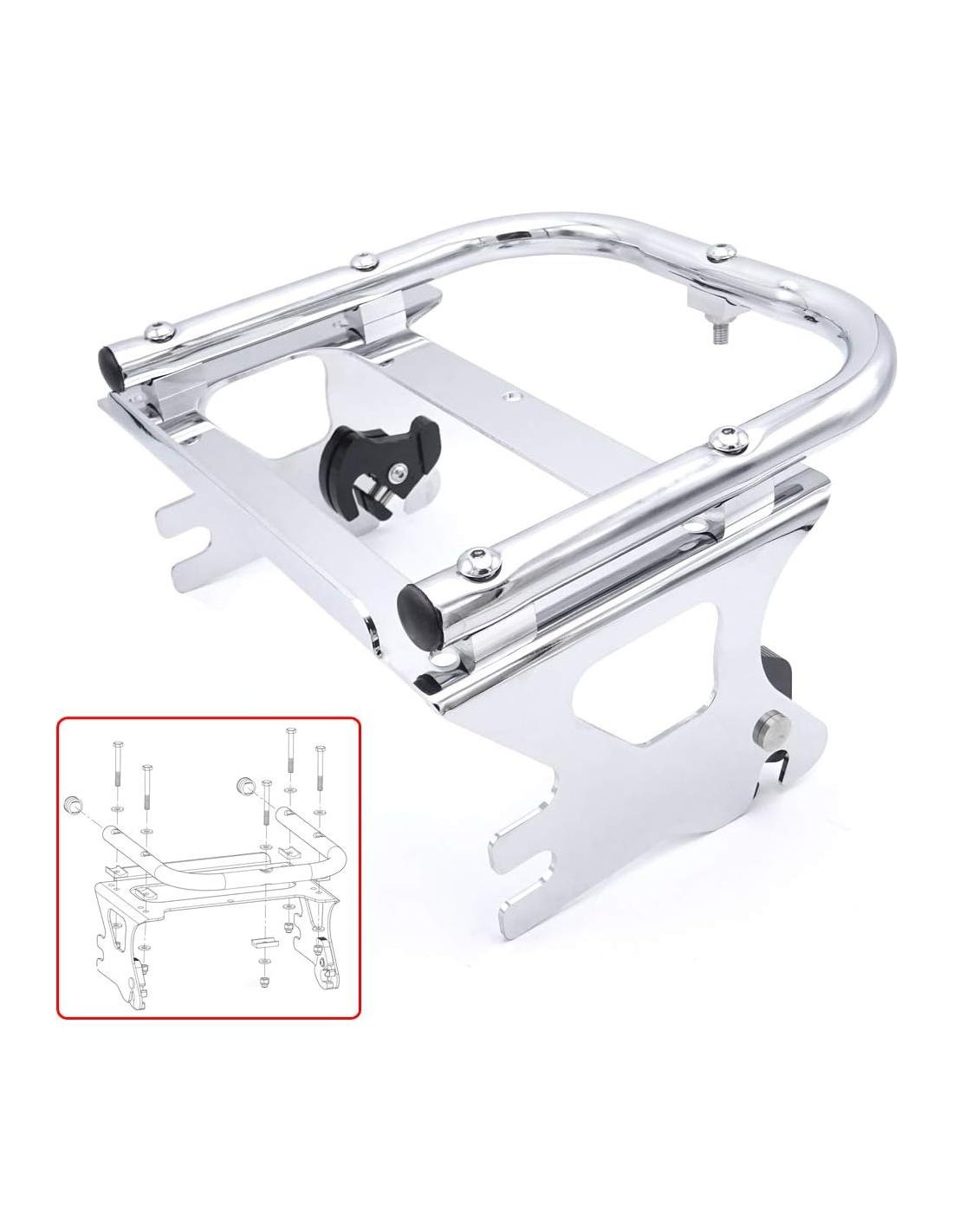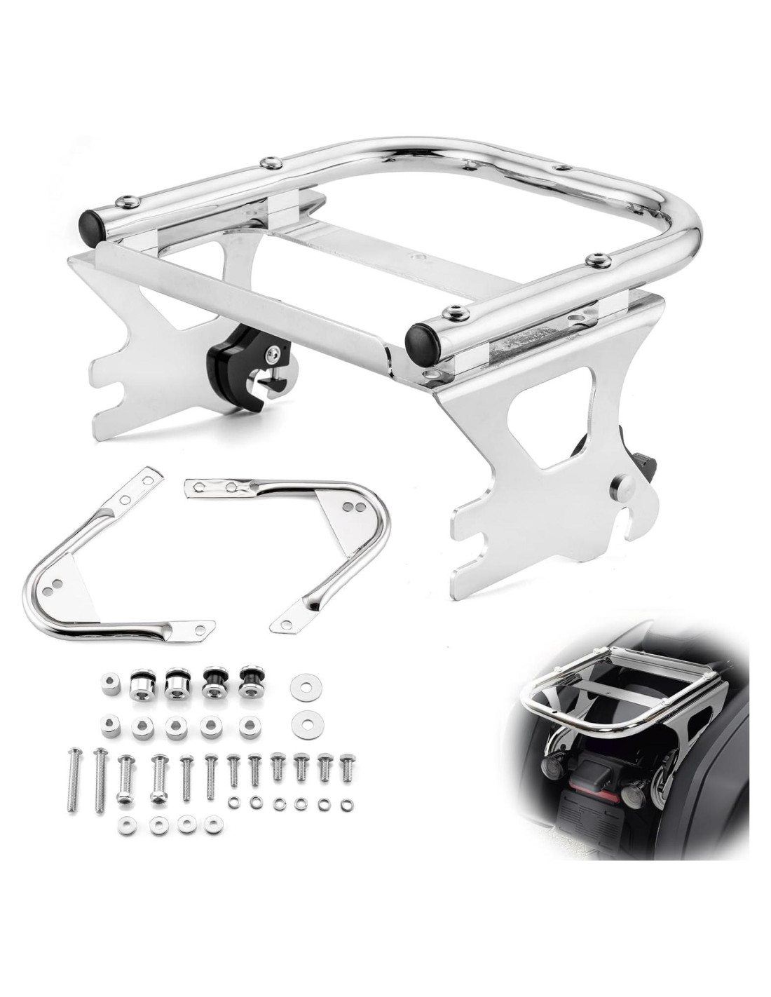- [Construcción Duradera] Nuestro soporte de equipaje y kit de hardware de acoplamiento están hechos de acero resistente con un acabado cromado y pueden soportar el desgaste del uso diario. Este soporte de montaje está construido para resistir las exigencias de la carretera, es resistente a la corrosión y puede ser probado por rociado de sal 48 horas al día.