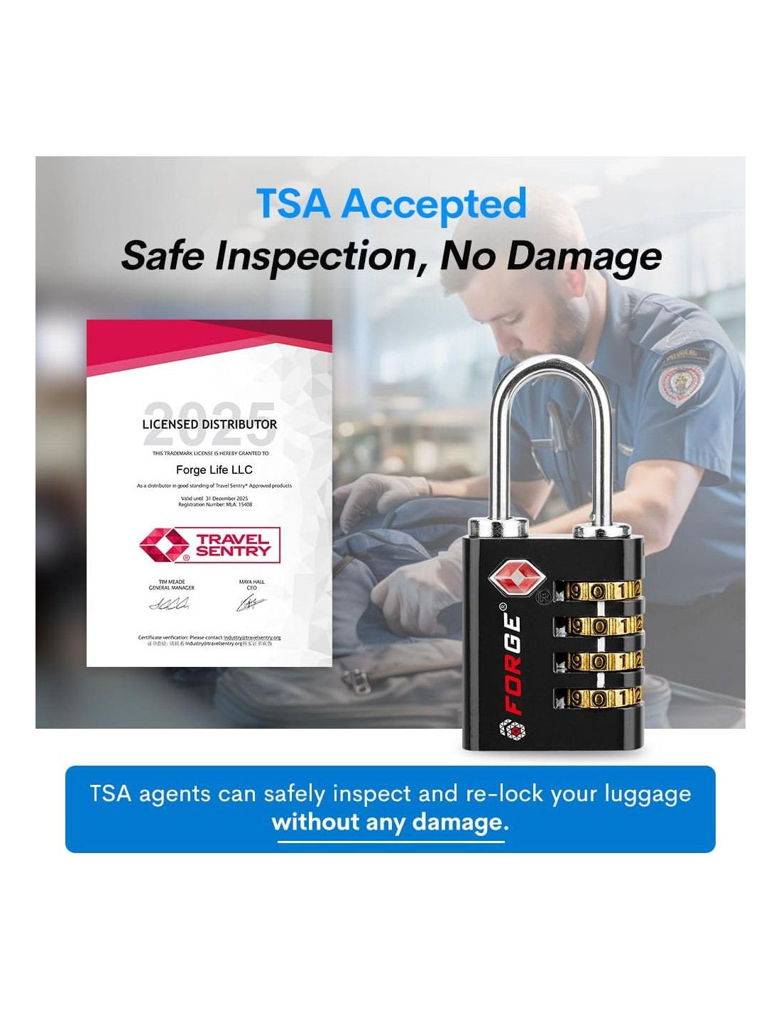- Cerraduras para Equipaje Aprobadas por la TSA: Las cerraduras aprobadas por la TSA de Forja son reconocidas por la TSA, con dos logotipos de la TSA en la parte delantera y trasera de la cerradura, lo que las hace sin complicaciones para las inspecciones de seguridad en el aeropuerto. Las cerraduras de viaje Forja se pueden usar en una amplia variedad de artículos además de maletas o equipaje. Estas cerraduras se pueden usar en una caja de herramientas, caja pelican, maletín, casillero de gimnasio, bolso, mochila o bolsa de laptop.