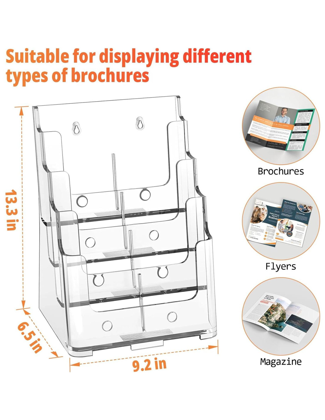 - ESPACIO FLEXIBLE Este soporte de folletos de 4 compartimentos puede sostener folletos de hasta 8.5 x 11 pulgadas (A4, tamaño carta), y cada uno de sus espacios es lo suficientemente grueso para sostener 150 hojas de papel. Cuando insertas los divisores, puede convertirse en un soporte de exhibición de folletos de 8 compartimentos para folletos de 4 x 9 pulgadas.
