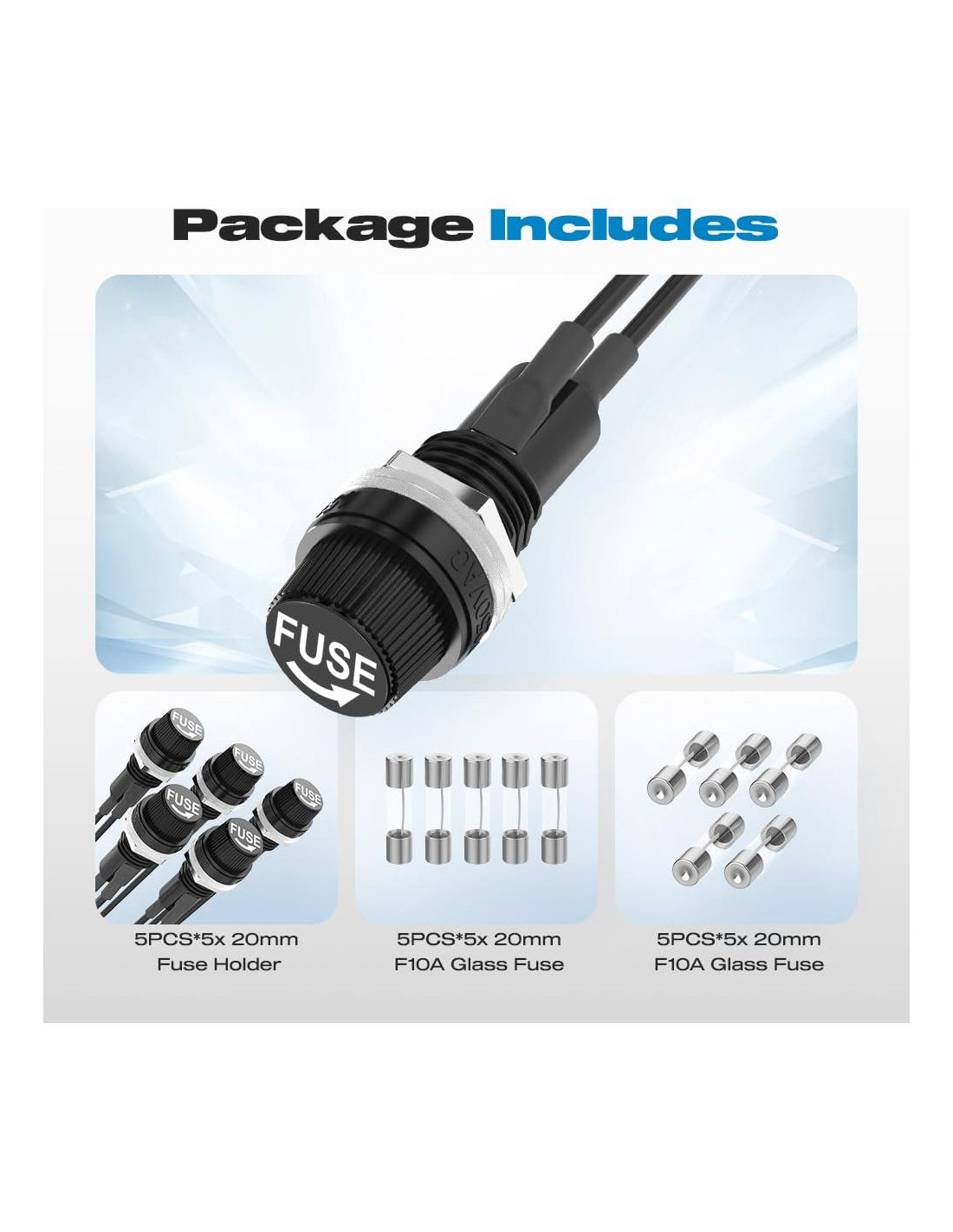- Contenido del Paquete: 5 portafusibles de montaje en panel con cables pre-soldados, 5 fusibles de tubo de vidrio de 10A, 5 fusibles de tubo de vidrio de 15A.