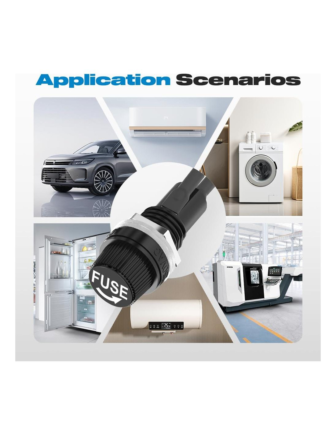 - Equipado con Fusibles: Incluye fusibles de vidrio de acción rápida de 10A y 15A (5x20mm) para satisfacer diversas necesidades. Los fusibles se funden inmediatamente cuando se sobrecargan, previniendo efectivamente pérdidas importantes.