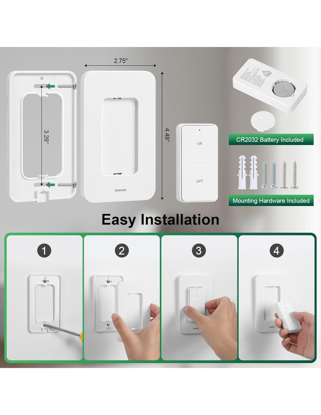 Fácil de Usar, sin cableado complejo en la pared o necesidad de WiFi, ¡una forma sencilla y confiable de iluminar tu espacio! treewell se dedica a desarrollar nuevas tecnologías y soluciones integradas, continuamente empujamos los límites de lo que es posible, mejorando tu estilo de vida. Con una diversa gama de ofertas en Herramientas y Mejora del Hogar, Electrónica de Consumo y Equipos para Exteriores, treewell abraza el rigor científico, la estética del diseño, la practicidad y los valores centrados en el cliente para ofrecer productos que superan las expectativas. Agrega solo 1.77" (4.49 cm) a tu fixture de luz existente, no afectará la forma general de tus lámparas. Por favor, mide tu fixture de luz antes de usar. El portalámparas adopta una estructura de más orificios de enfriamiento, mejora la ventilación y el efecto de disipación de calor, y extiende la vida útil del portalámparas. Di adiós a tener que levantarte para encender y apagar tus luces, es conveniente para los ancianos, mujeres embarazadas y personas con discapacidad. Lista de Empaque: 1 x Interruptor de Pared 1 x Portalámpara Hardware de Montaje Incluido Portalámparas Inalámbrico Portalámparas Inalámbrico Portalámparas Inalámbrico Kit de Interruptor de Luz Inalámbrico Kit de Interruptor de Luz Inalámbrico Kit de Interruptor de Luz Inalámbrico