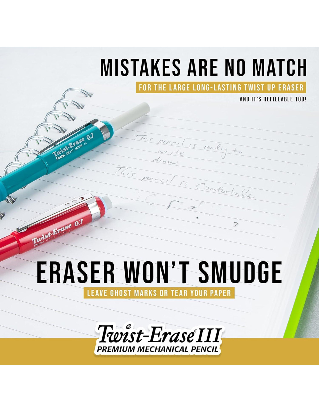 Parte de la popular familia de productos Pentel Twist-Erase. El nuevo diseño del barril presenta un agarre suave y libre de látex para el máximo confort al escribir. La punta de 0.7mm (0.0276 pulgadas) produce líneas nítidas y medianas de densidad consistente. La goma de borrar alta, de 1 1/4" (3.175 cm) es más grande que todas las gomas de borrar de lápiz ordinarias y aumenta el valor. Recargable con mina Pentel Super Hi-Polymer y goma de borrar E10. 1 lápiz y 1 goma de borrar de repuesto incluidos en el paquete.