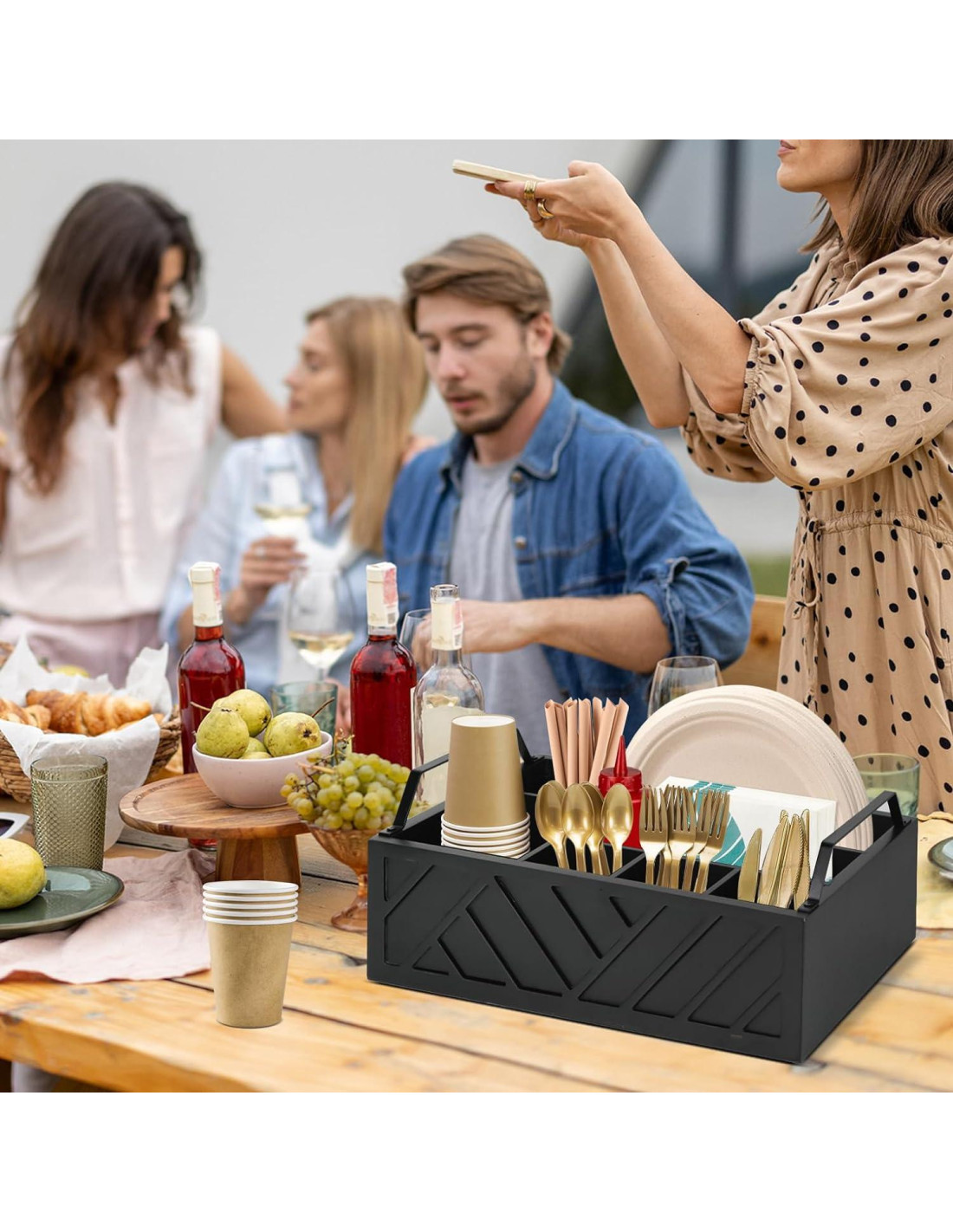 - Dispensador de platos de papel con asas para mantener organizado. Nuestro soporte de platos de papel para encimera tiene 6 compartimentos, lo que te ayuda a separar y organizar platos desechables, cucharas, tenedores, cuchillos, servilletas, tazas de papel, popotes. Las asas a ambos lados hacen que este caddy de utensilios de madera sea fácil de llevar. Y el diseño abierto en la parte superior te permite acceder fácilmente a todos los platos o condimentos. Organiza y almacena eficientemente tus utensilios de cocina mientras ahorras espacio en tus gabinetes o cajones con este caddy de cubiertos.