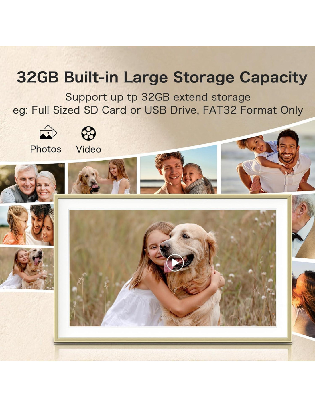 - Compartir Instantáneo a través de la APP Frameo; Conecta tu marco a WIFI y comparte fotos y videos (máx. 15s) rápidamente a través de una App confiable - Frameo a nuestro marco de fotos electrónico desde cualquier lugar, de forma privada y segura, sin límite de número de miembros. Para aquellos que ya tienen un marco digital Frameo, no es necesario descargar otra app. Tiene 32GB de memoria interna y soporta hasta 32GB de almacenamiento externo, lo que te permite compartir más de 50,000 fotos. Además, puedes transferir a través de almacenamiento externo o a través de una computadora, no se necesita Wi-Fi.
