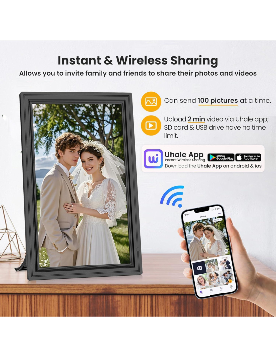 - Comparte Fotos/Videos Instantáneamente a Través de la APP "Uhale" Descarga la app Uhale, disponible para Android e iOS, y disfruta de acceso gratuito de por vida. Conecta el marco digital de 15.6" a WiFi, y usa el control remoto para completar la configuración en solo un minuto. Sin limitaciones de distancia, puedes enviar fotos/videos desde tu teléfono al marco, transfiriendo hasta 100 fotos o videos (hasta 120s cada uno) a la vez. Comparte tus recuerdos preciados con familiares y seres queridos, ¡sin importar dónde estén!