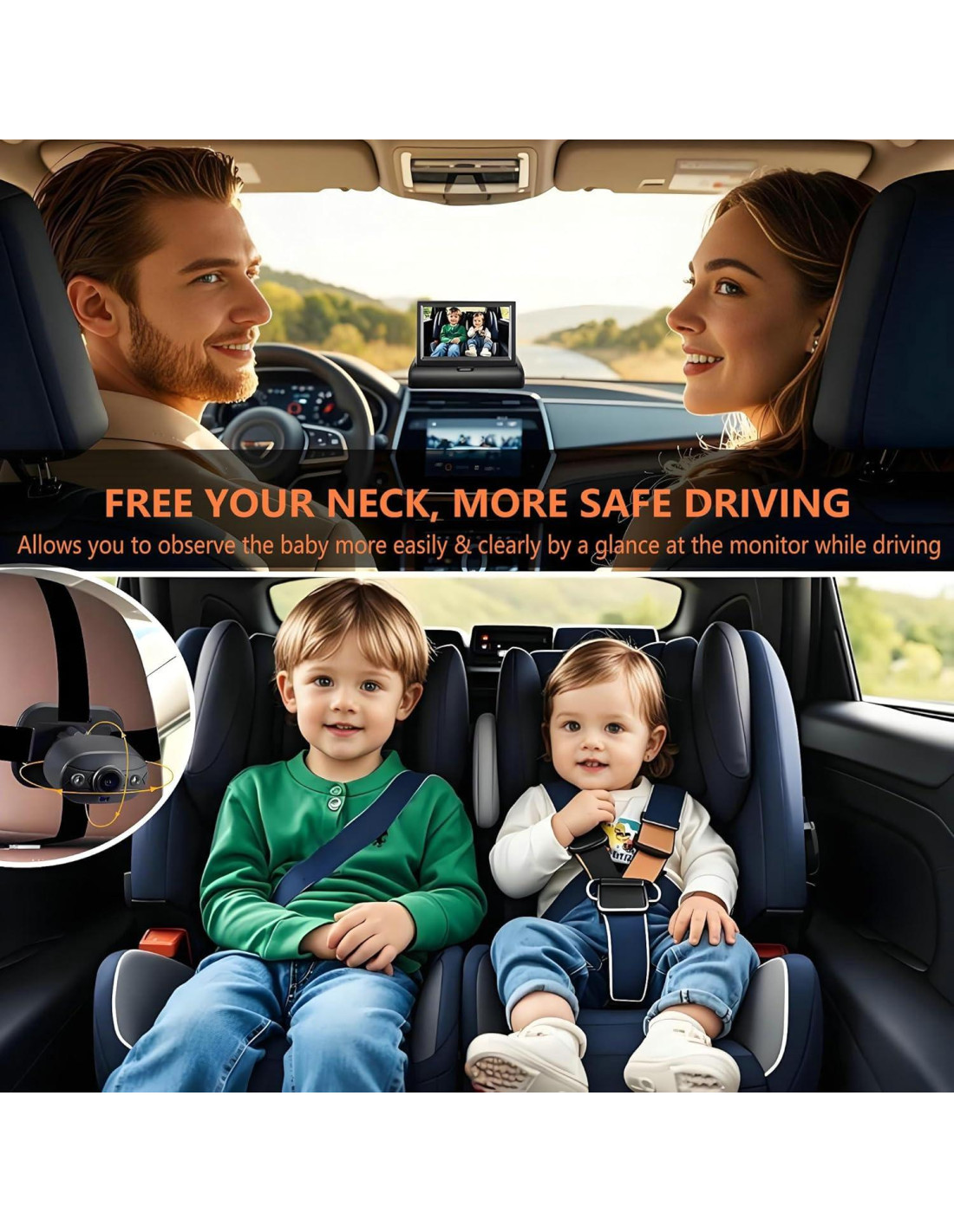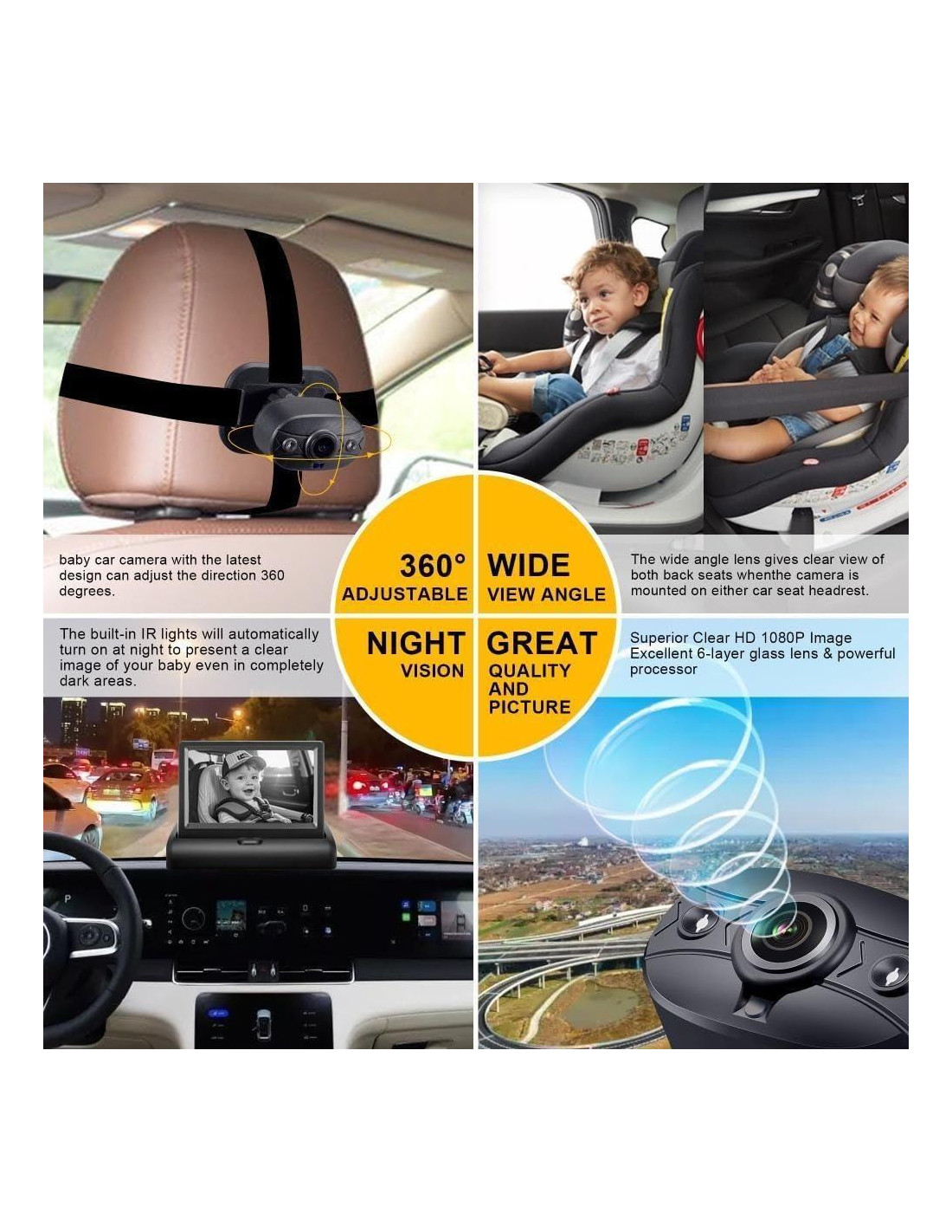 - Cámara para bebé ajustable y rotativa de 360 grados: La cámara para bebé en el coche puede ajustar los ángulos de 360 grados según el modelo de tu coche y el tamaño del asiento de seguridad del coche. Puedes cambiar la imagen a normal o imagen espejo dependiendo de la posición del bebé en el asiento del coche. La cámara para bebé adopta el último chip de alto rendimiento mejorado con una excelente capacidad de control de calor, lo que puede proporcionar un voltaje de salida estable, más seguro y duradero, evitando el problema de calentamiento debido al uso prolongado.