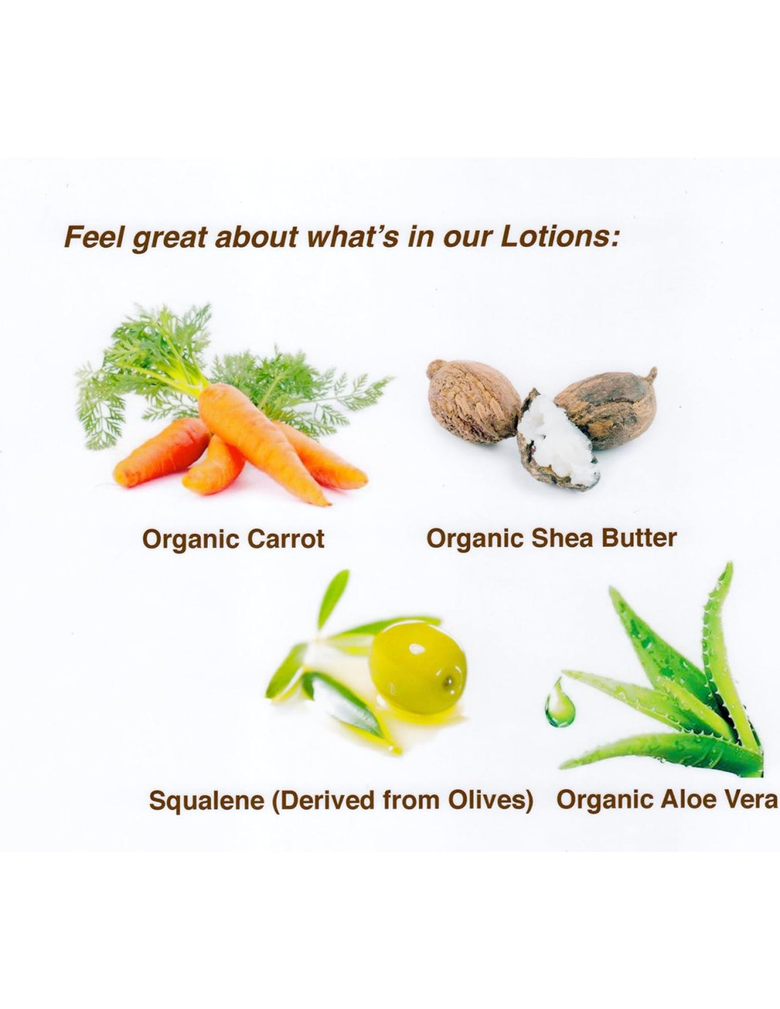 - Loción de zanahoria orgánica certificada que calma la piel y extiende un bronceado de aspecto saludable.
