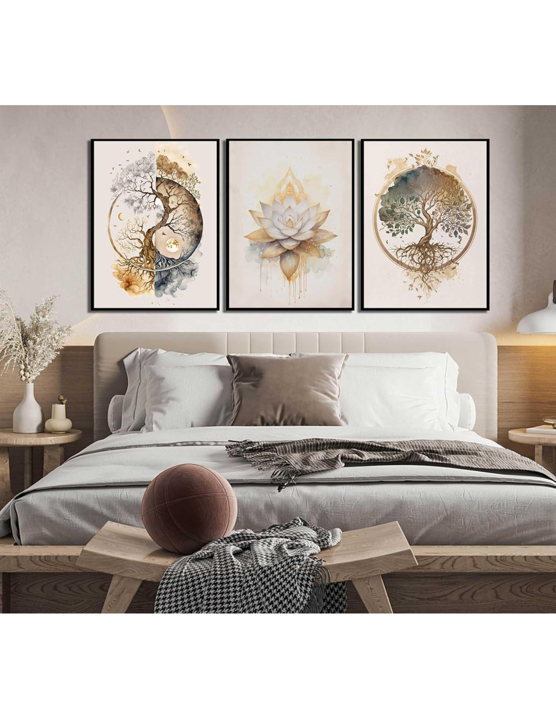 - [Pintura de Lienzo Loto Dorado Zen Moderna] : Nuestros tres diseños modernos de loto dorado te sumergen en tranquilidad y paz, y son ideales para la decoración de paredes zen y decoración de paredes de loto. Los elegantes patrones de loto y el abstracto yin y yang crean una atmósfera calmada, lo que es una gran elección para la decoración de la sala de yoga o el espacio de meditación.