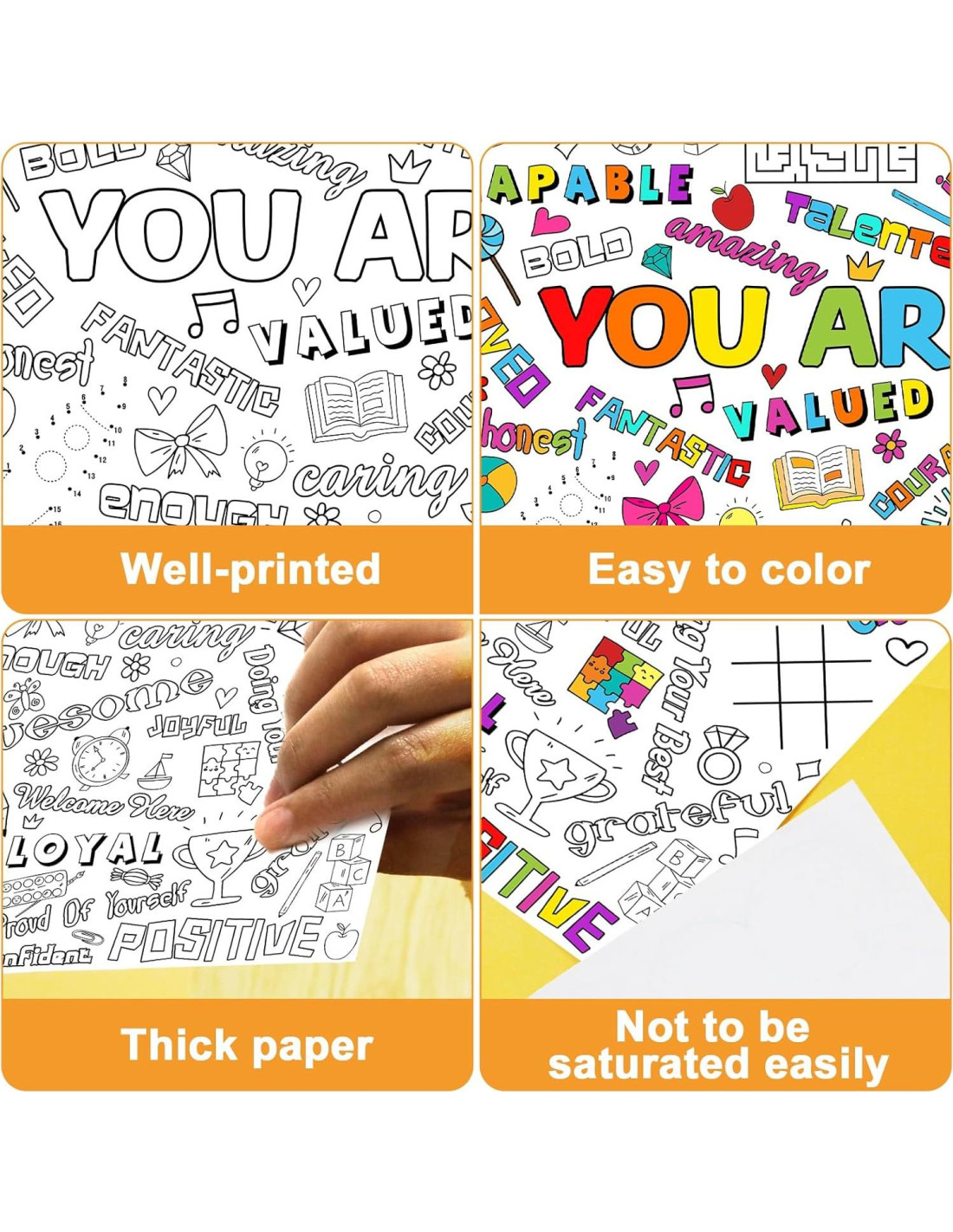 - Póster gigante para colorear afirmaciones positivas: Obtendrás un mantel gigante para colorear afirmaciones de 210 x 120 cm (83 x 47 pulgadas) y es lo suficientemente grande como para mantener a los niños comprometidos y disfrutar de su actividad divertida y permitirles estudiar, trabajar y jugar juntos como una actividad grupal en casa.
