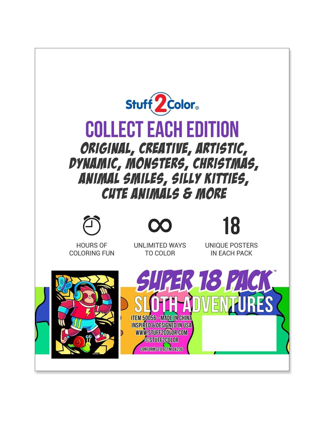 - Componentes incluidos: 18 pósters sin colorear (cada uno con una aventura de perezoso)