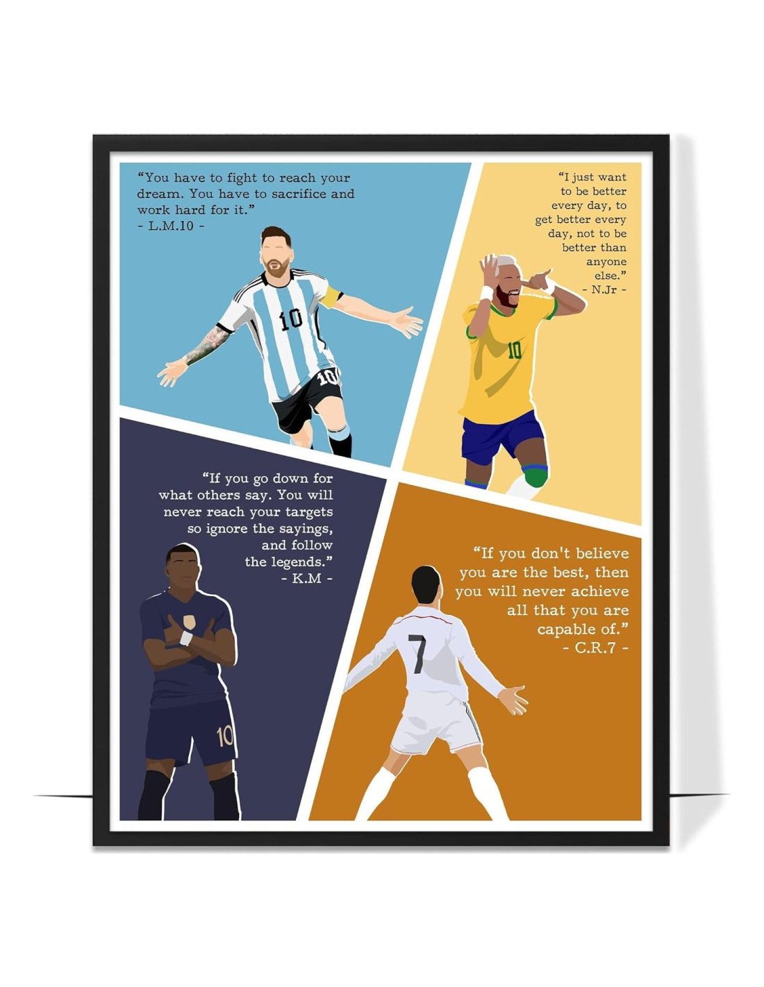 - Arte Decorativo Motivacional Dibujo a Mano: Esta audaz obra de arte dibujada a mano captura el alma del fútbol a través de líneas crudas y trazos intencionales, dando vida a cuatro jugadores legendarios con emoción y poder. Cada cita, cada pose es más que un diseño; es una historia, una chispa del espíritu humano. Las imperfecciones hablan más fuerte que la perfección jamás podría, convirtiendo esto en una pieza significativa para cualquiera que crea en la pasión, la persistencia y el arte del juego.