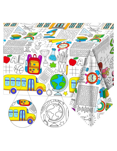 - Diseño creativo: El diseño del mantel de colorear DIY grande está diseñado con varios patrones de escuela, autobús escolar, mochila, regla y bolígrafo. Y la cubierta de mesa gigante para colorear de regreso a clases para niños también está diseñada con rompecabezas como juegos de laberinto que pueden despertar el interés de tus hijos y son beneficiosos para los estudiantes.