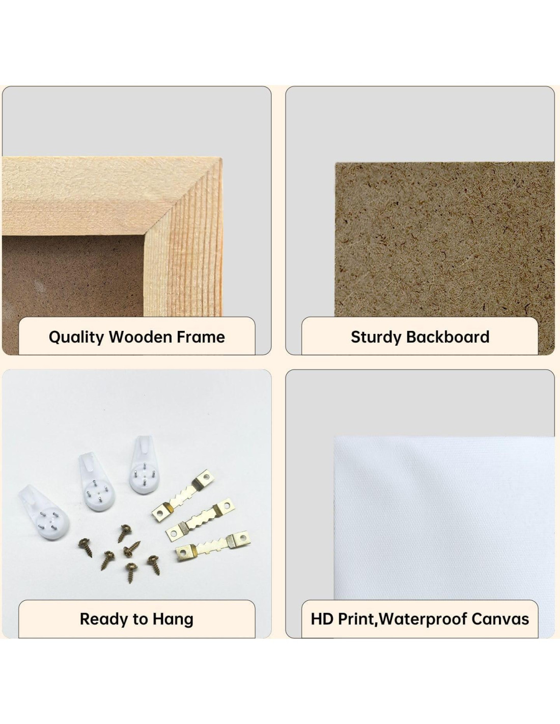 - Fácil de Colgar: Cada impresión en lienzo ha sido estirada sobre un marco de madera sólida, envuelta en galería, con ganchos y accesorios, lista para colgar sin complicaciones.