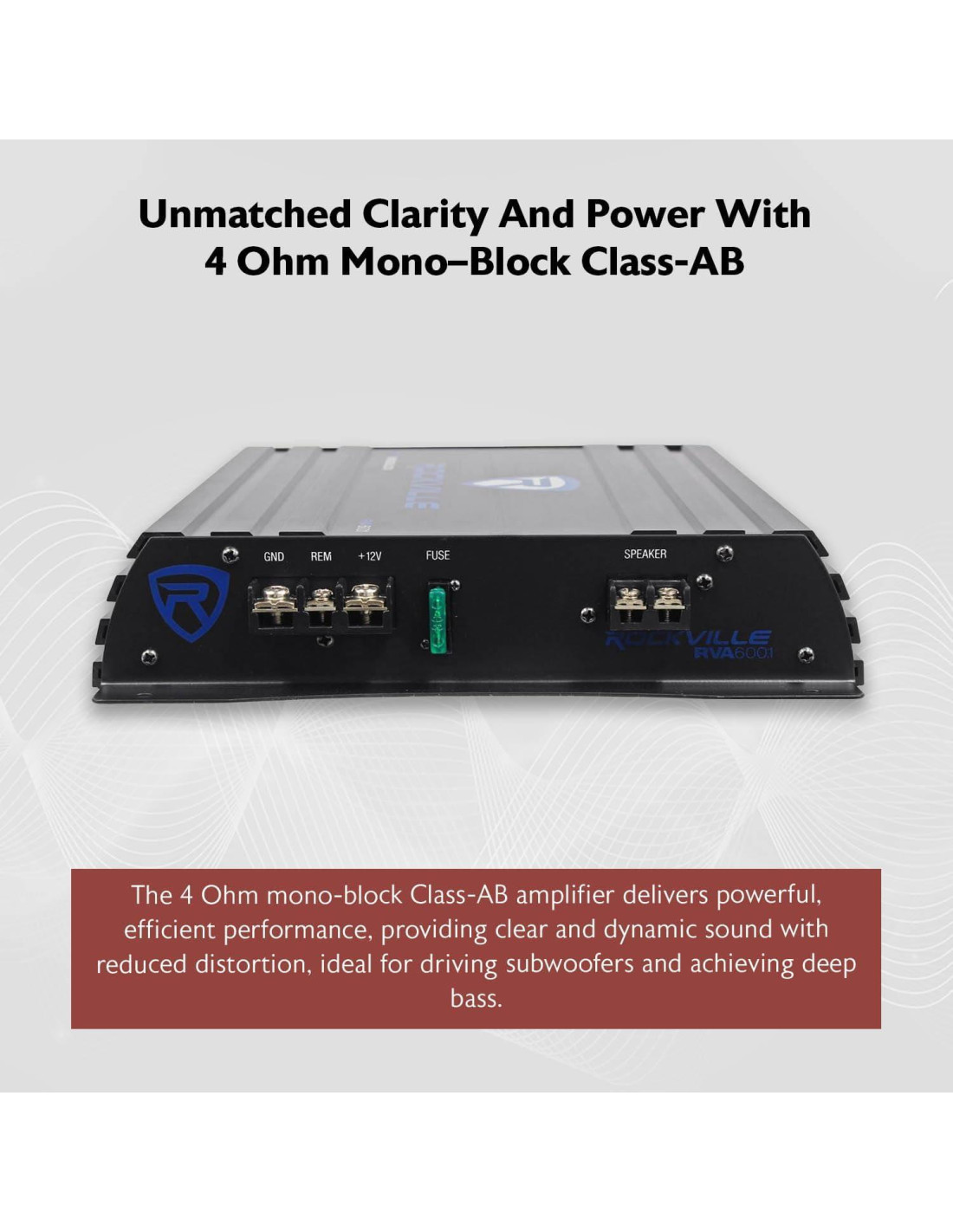 Amplificador de coche mono Rockville RVA600.1 1200 Watts pico/200 Watts RMS Clase AB con control remoto de graves, integración OEM, circuito de encendido automático - totalmente ajustable +/- 12dB ecualizador de graves de Q estrecho @ 45Hz - filtro de paso bajo totalmente ajustable: 50Hz - 250Hz - filtro subsonico totalmente ajustable: 10Hz - 50Hz