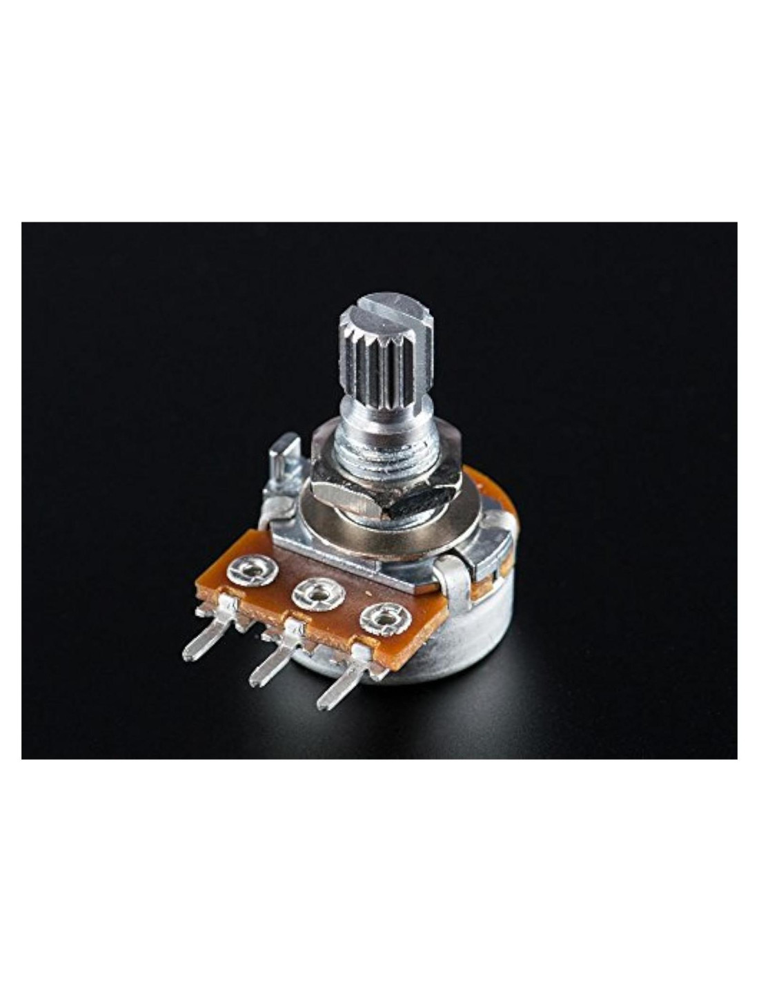 Este potenciómetro es un dos-en-uno, bueno en una breadboard o con un panel. Es un potenciómetro de 10K ohmios de taper lineal bastante estándar, con un eje antideslizante. Es suave y fácil de girar, pero no tan suelto que se mueva por sí solo. Nos gusta este porque las patas están a 0.2" (5.08 mm) de distancia con puntas, así que puedes enchufarlo en una breadboard o perfboard. Una vez que termines de prototipar, puedes perforar un agujero en tu caja de proyecto y montar el potenciómetro de esa manera. Especificaciones del artículo 10K ohmios potenciómetro, taper lineal 100,000 Ciclos de Vida 16mm Cuerpo Viaje rotacional: 300 Fuerza de parada estática: 90 oz-in (0.64 Nm) Par rotacional: 0.5 a 1.25 oz-in (0.035 a 0.088 Nm)