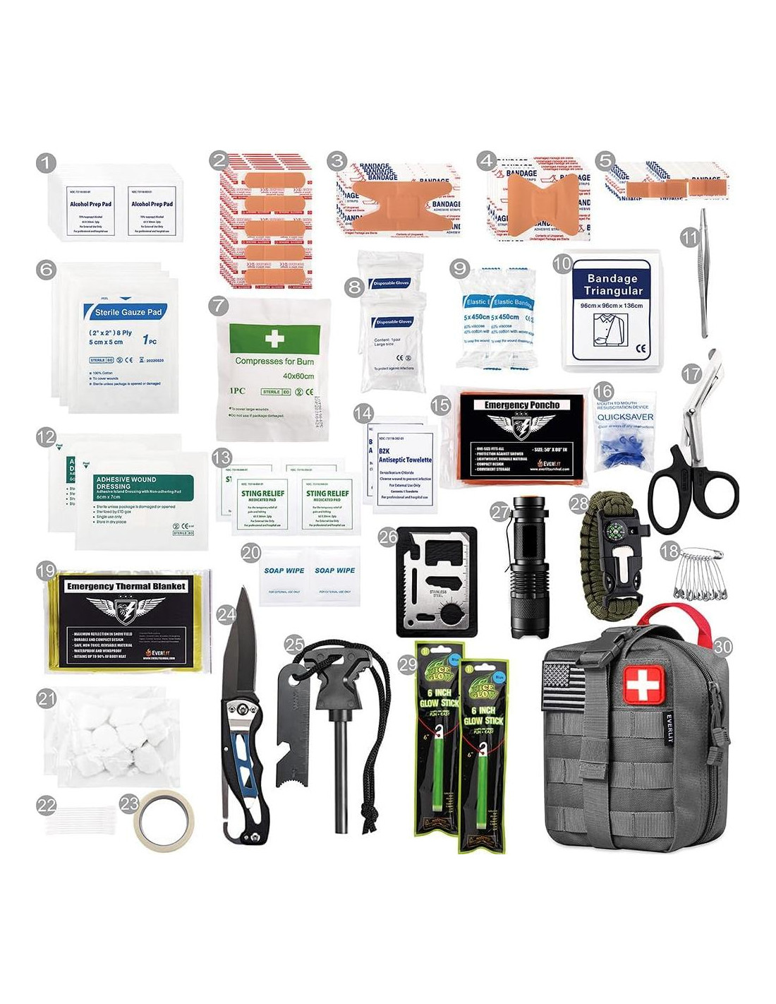 - [Equipos de Supervivencia de Alta Calidad Protegen Tu Próxima Aventura] Lleno de los gadgets de supervivencia más esenciales: manta espacial mylar, linterna táctica de 3 modos, pulsera de paracord multifuncional (brújula, silbato), piedra de yesca, cuchillo, tarjeta de sable, dos varitas de luz de 12 horas y poncho de lluvia de emergencia.