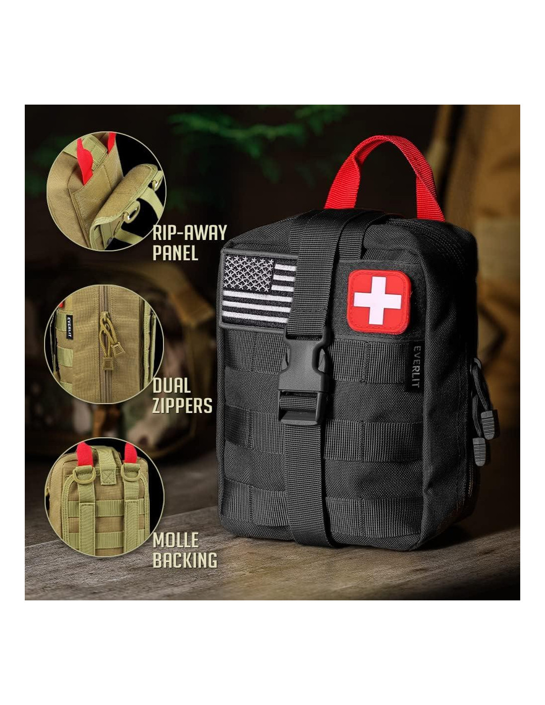 - [Bolsa Molle EMT, Duradera, Portátil y Resistente al Agua] La bolsa de grado militar está hecha de nylon resistente al agua 1000D, ofrece tres grandes compartimentos y muchas correas para organizar tus suministros. Las dimensiones generales del kit son 8 pulgadas (20,32 cm) x 6.5 pulgadas (16,51 cm) x 5 pulgadas (12,7 cm). El kit se puede adjuntar a cualquier sistema molle: mochila, chaleco, panel molle de vehículo.