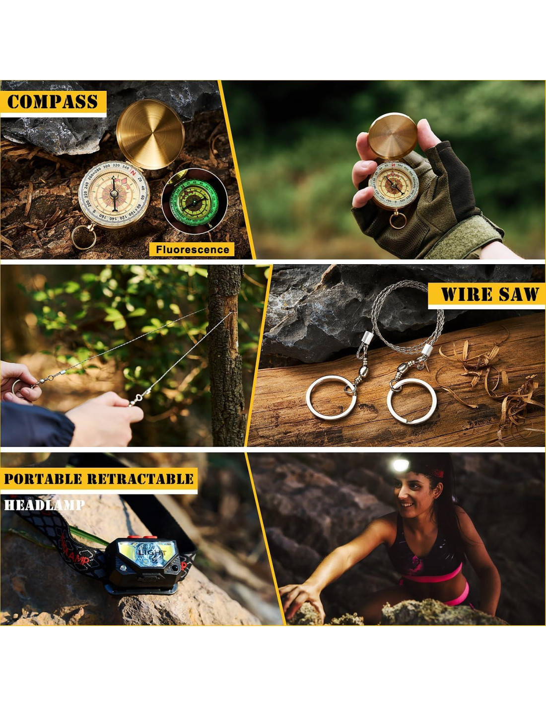 - Equipo de Supervivencia Práctico: Este kit incluye los accesorios de supervivencia más populares: un hacha multifuncional, una linterna de 3 modos, un taladro de carpintero, una sierra plegable, una tarjeta multifuncional, una pulsera de supervivencia, un silbato, una sierra de alambre, un paracord, una manta de emergencia, herramientas para encender fuego, herramientas de pesca, un kit de primeros auxilios completo y más. Todo este equipo asegura que tengamos los elementos básicos de supervivencia en el exterior.