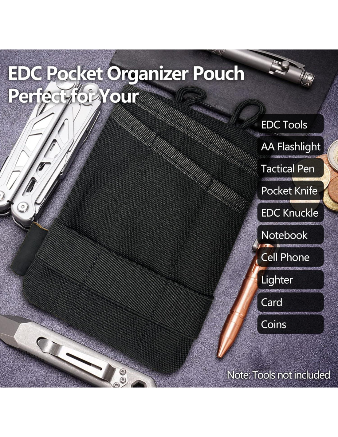 - Organización Eficiente: 3 ranuras frontales para equipo EDC, 1 ranura grande para teléfono móvil o cuaderno, 1 bolsillo con cremallera para tus monedas, cambio, tarjetas de identificación para mantener tus esenciales organizados. Almacena y accede fácilmente a tus herramientas sin el problema de artículos enredados o extraviados