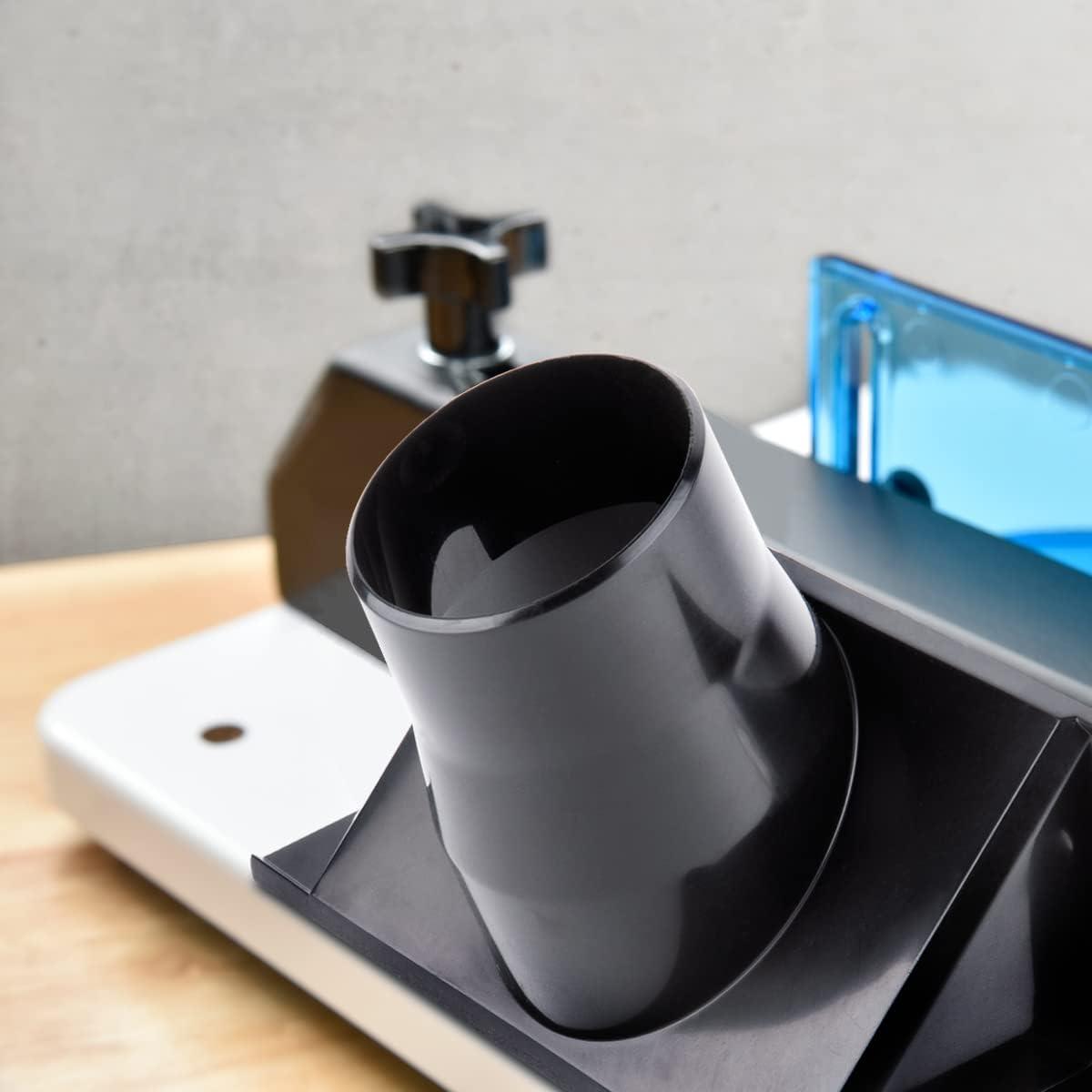 Esto es especialmente útil para pequeños talleres con espacio limitado, especialmente si planeas usar una router tanto para aplicaciones de mesa como de mano. Reemplazas la base con la base acrílica redonda suministrada y luego puedes cambiar literalmente entre la configuración de mano y la de mesa en segundos. El diseño es simple pero práctico. Para ajustar la altura de la broca, levanta de la mesa y ajústala como lo harías en la configuración de mano, luego vuelve a colocarla en la mesa. Diseñ