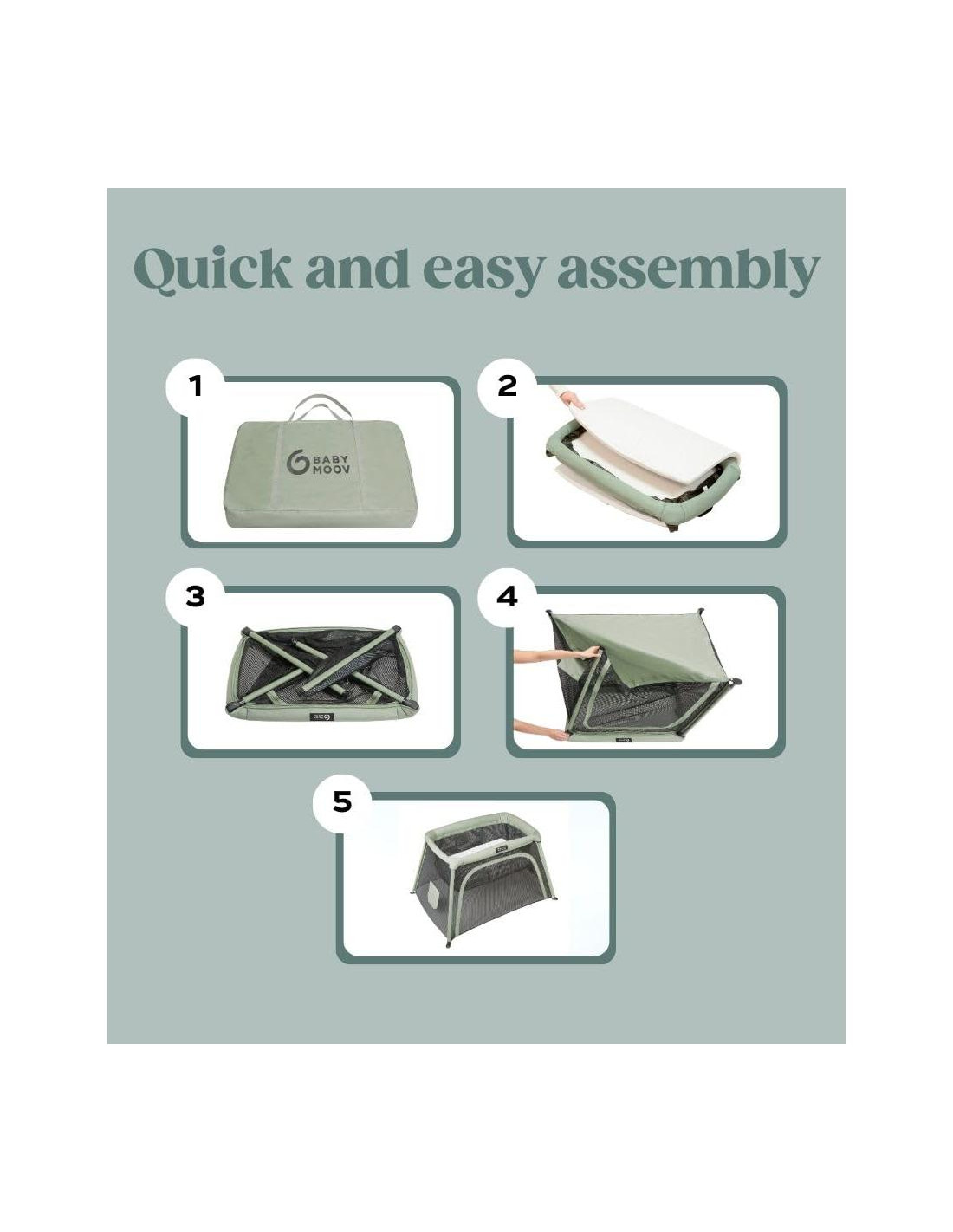 En Babymoov, nuestra misión? Cualquiera que sean tus aventuras, estamos a tu lado para ofrecerte. Nacido para ser tu aliado en la crianza, Babymoov evoluciona con tu estilo de vida y deseos. Juntos, nos adaptamos a cada etapa de tu viaje. Babymoov siempre innova y te ofrece productos responsables e innovadores para que puedas vivir la vida al máximo con tu familia. Con 25 años de experiencia, Babymoov se destaca en la creación de productos que priorizan la seguridad, utilidad y comodidad, estableciendo un estándar para las soluciones modernas de crianza. Babymoov co-crea soluciones prácticas con los padres, empoderándolos con confianza en sus rutinas diarias, asegurando conveniencia y calidad. Diseñados en Europa, los diseños de Babymoov, creados con cuidado, priorizan la longevidad y la reparabilidad. Ser padres hoy significa embarcarse en aventuras familiares o simplemente visitar a la abuela y al abuelo con tu bebé. Para asegurar esta movilidad, entendemos la importancia de tener los productos adecuados que faciliten tu vida. Es en este enfoque que hemos diseñado nuestra cuna de viaje Moov y Comfy 3 en 1, ligera, que se pliega y despliega en segundos. Una cuna práctica, cómoda y ultraestable desde el nacimiento hasta el cuarto año de tu bebé. A la vez, 1 cuna para bebés (desde el nacimiento > 9 kg), 1 cuna de viaje (hasta 4 años) y área de juego. 2 colchones para cada nivel, con un grosor de 2.54 cm y una densidad de 55.1 libras por metro cúbico. Montaje/desmontaje en menos de 1 minuto: es posible plegar la cuna sin quitar la cuna para bebés. ESPACIOSA. Cuna para bebés = 48 x 80 cm / Cuna de viaje = 118 x 78 cm - sábanas 70 x 140 cm. 2 bolsillos de almacenamiento - Amplia apertura para transformarse en un área de juego - Buena ventilación. ¿Qué accesorios se incluyen con la cuna de viaje Moov & Comfy? La cuna de viaje viene con 1 colchón para la cuna para bebés (48 x 80 cm), 1 colchón para la cuna de viaje (118 x 78 cm - compatible con sábanas de 70 x 140 cm) y 1 bolsa de transporte con asas. ¿Cuáles son las dimensiones y el peso de la cuna de viaje Moov & Comfy? Cuando está plegada, la cuna de viaje mide 90 x 14 x 58 cm. Una vez desplegada, mide 121 x 83 x 71 cm. Pesa 5.9 kg (5.2 kg sin la cuna para bebés). ¿Hasta qué edad puedo poner a mi bebé en la cuna para bebés? En la cuna de viaje? Puedes usar la cuna para bebés desde el nacimiento hasta que tu bebé pueda rodar (aproximadamente 6 meses). A partir de ese momento, puedes usar el nivel inferior de la cuna de viaje hasta que tengan alrededor de 4 años. ¿Cuál es la densidad de los colchones incluidos con el Moov & Comfy? Los 2 colchones incluidos (1 para cada nivel: cuna para bebés y cuna de viaje) son ultra cómodos para tu bebé, con un grosor de aproximadamente 2.54 cm y una excelente densidad de aproximadamente 55.1 libras por metro cúbico. ¿Son los colchones extraíbles? Sí, ambos colchones son extraíbles y lavables a máquina a 30C.