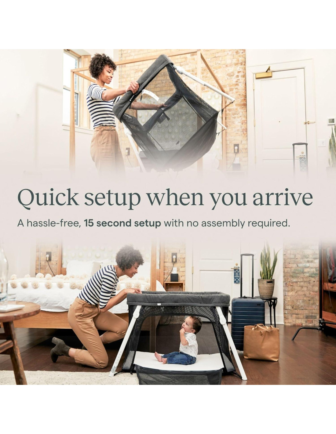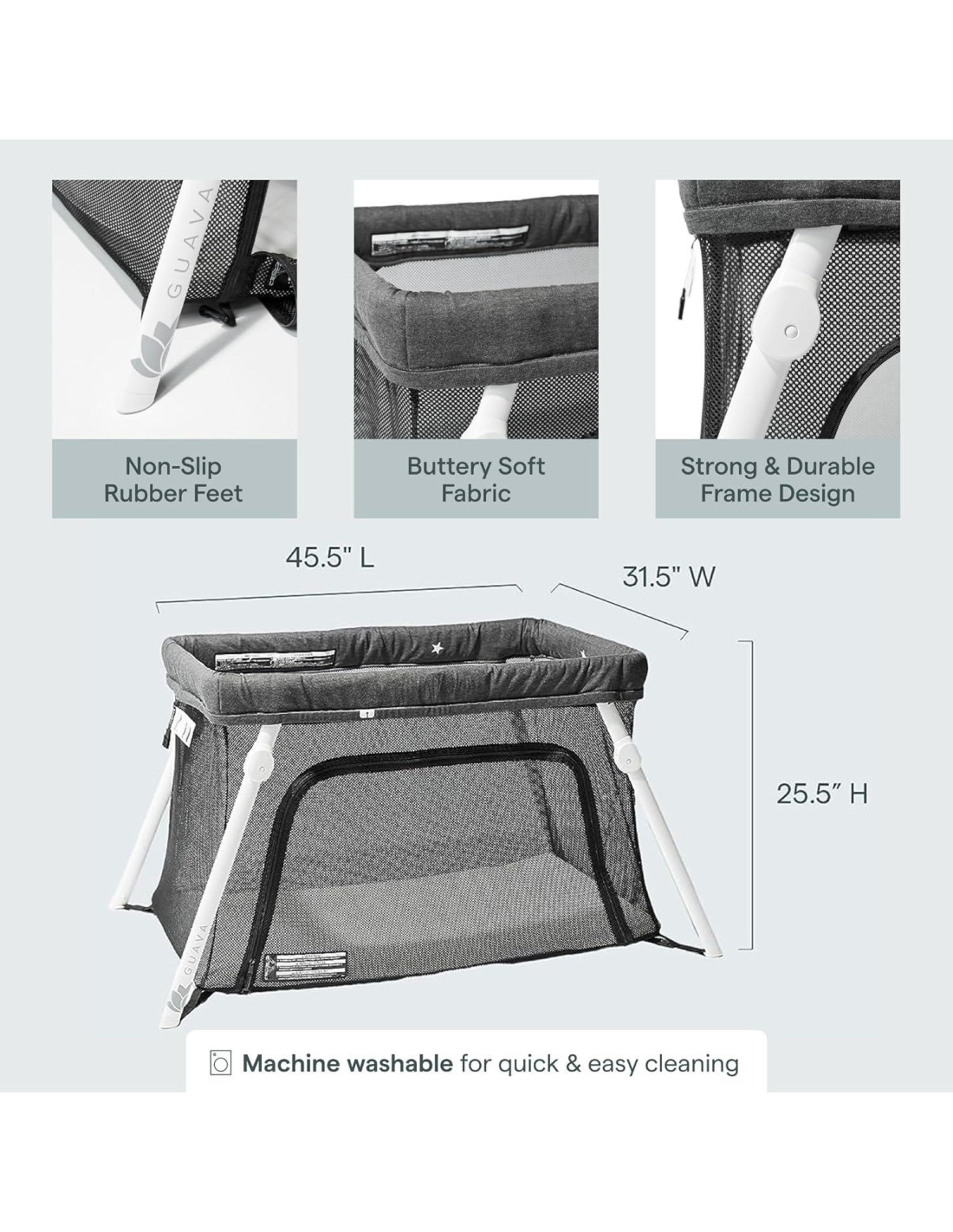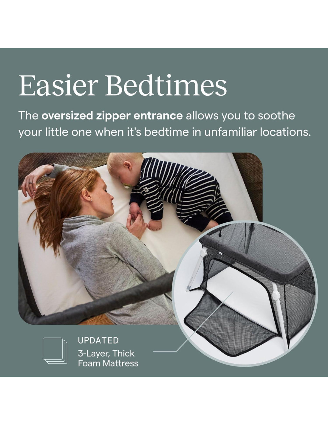- CONSTRUYE UN MEJOR VÍNCULO. Desabrocha silenciosamente y fácilmente la puerta lateral bloqueable para ayudar a tu bebé a dormir o convierte la cuna portátil en un parque de juegos. Con la puerta abierta, puedes amamantar o acurrucar a tu pequeño para ayudarlo a sentirse seguro y protegido en un lugar nuevo y fomentar una conexión aún más fuerte. El colchón aislante actualizado tiene una espuma gruesa y suave aprobada para dormir durante la noche (edades 0-3), lo que lo convierte en un ambiente seguro y cómodo tanto para descansar como para jugar.