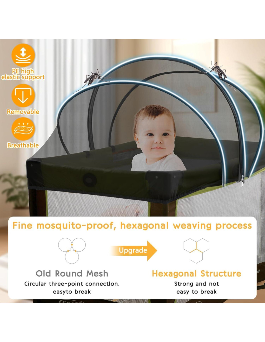 - Protección contra Mosquitos: Esta cubierta de cuna reforzada bloquea efectivamente los mosquitos, el pelo de mascotas y el polvo para un sueño más limpio y reducir alérgenos potenciales. Aunque proporciona una barrera protectora, siempre recomendamos supervisar a las mascotas alrededor del área de sueño de su bebé. Duerma más tranquilo sabiendo que su pequeño tiene una capa adicional de protección durante la siesta y la hora de dormir.