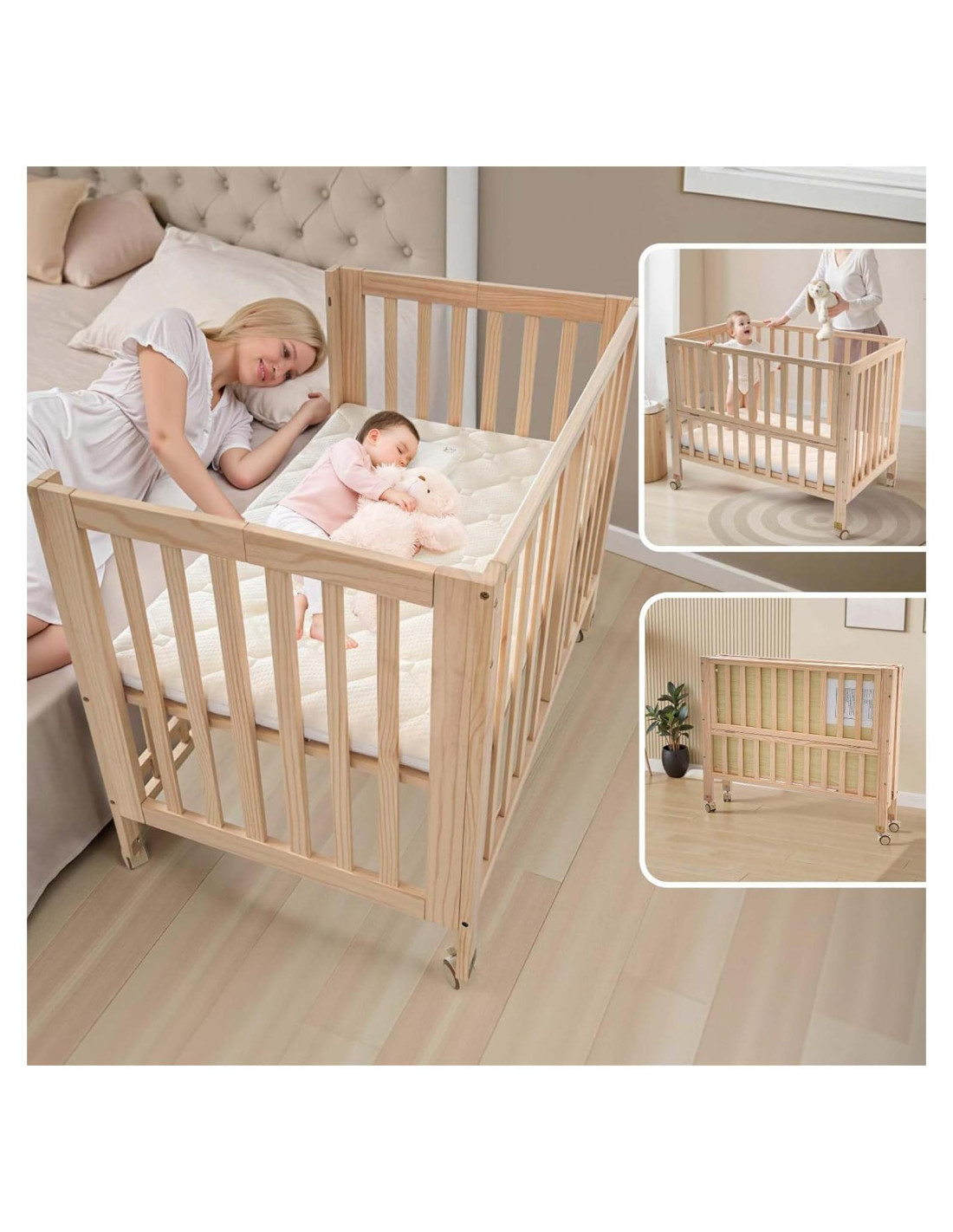 Nuestra cuna para bebés tiene cuatro modos que se pueden cambiar según tus necesidades, ofreciendo excelente aplicabilidad y practicidad. Nuestra cuna te mantiene a ti y a tu bebé al alcance y a la vista por la noche, permitiéndote vigilar a tu bebé en todo momento. Cuna de Lado Plegable. Cuna Mini Portátil para Bebés. Cuna Convertible 4 en 1. Cuna Mini para Dormir. Cuna Mini Portátil para Bebés. Cuna Convertible para Bebés. Cuna con Almacenamiento. ¿Cuál es la calidad de esta cuna? Está hecha de madera de pino, lo que proporciona excelente estabilidad y seguridad, sin astillas y con un acabado suave. ¿Cuál es el tamaño del colchón de esta cuna? El tamaño del colchón es 38*24" (96.5*61 cm), tamaño mini estándar, y los reemplazos se pueden encontrar fácilmente en el mercado de Amazon. ¿Cómo es el servicio postventa de este vendedor? Este vendedor puede responder rápidamente a las preguntas de los compradores y ayudar a resolver la mayoría de los problemas. Somos una empresa dedicada a productos para bebés, pero también una empresa que ha reclutado a más de 10 nuevas mamás, somos muy conscientes de las necesidades de las nuevas mamás y los recién nacidos, así como de las preocupaciones y demandas de las nuevas mamás sobre la calidad y seguridad del producto. Continuamos priorizando la seguridad, mientras desarrollamos constantemente nuevos productos para facilitar a las nuevas madres el cuidado de sus bebés.
