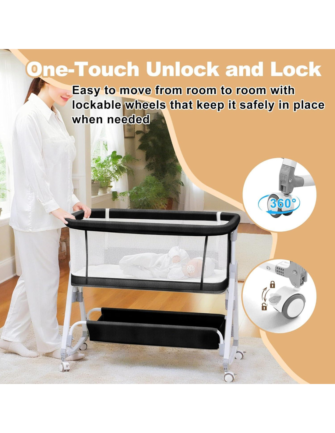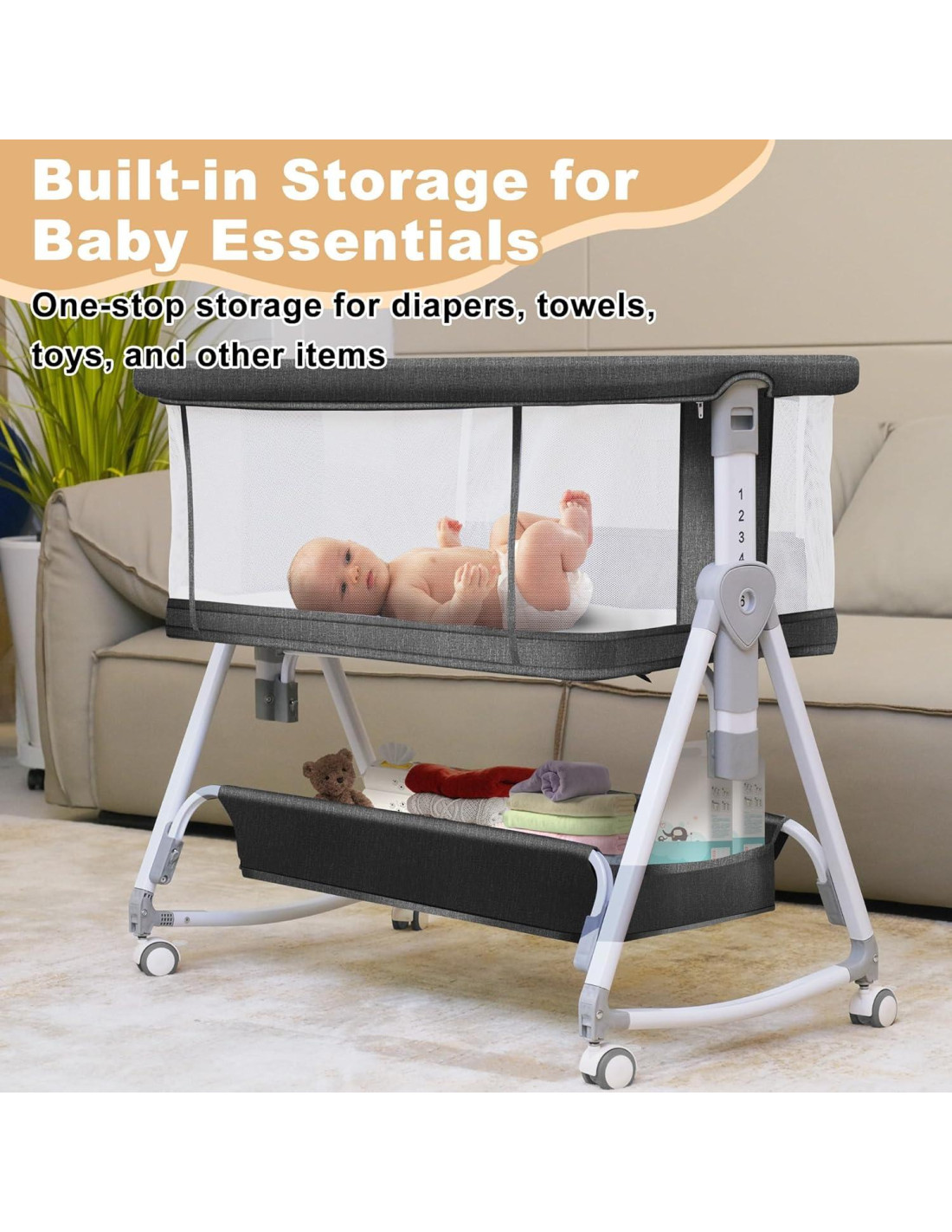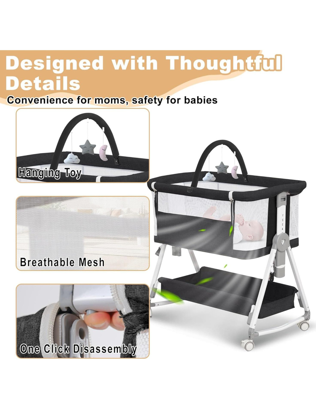 - DISEÑO ÚNICO: La cuna para bebé mejorada viene con lindos juguetes colgantes que pueden despertar la curiosidad del bebé. Además, un colchón suave y cómodo asegura confort. La cuna lateral también incluye una gran canasta de almacenamiento, lo que te permite mantener los elementos esenciales del bebé al alcance.