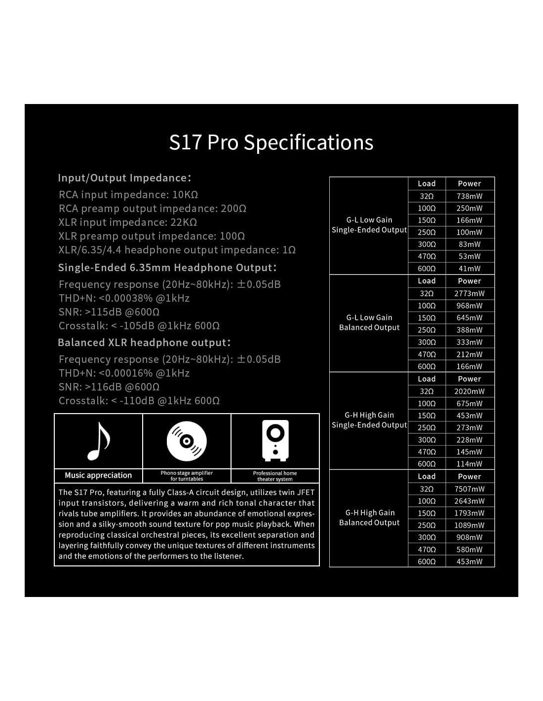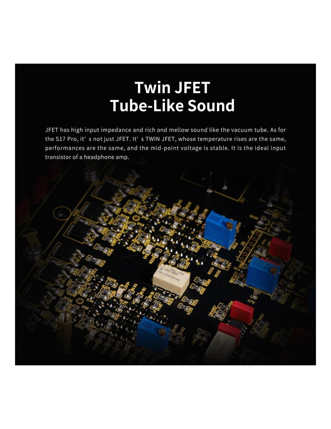- [Twin JFET | 2 pares de transistores por canal] JFET tiene alta impedancia de entrada y sonido rico. El Twin JFET del S17 Pro es más que eso: mismas subidas de temperatura, mismas prestaciones y voltaje de punto medio estable. Es el transistor de entrada ideal para un amplificador de auriculares. | La etapa de salida final utiliza 2 pares de transistores de salida en paralelo. Todo el dispositivo tiene hasta 16 transistores de salida. La salida máxima es de hasta 7.5 W. Puede manejar todo tipo de auriculares e IEMs con facilidad.